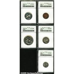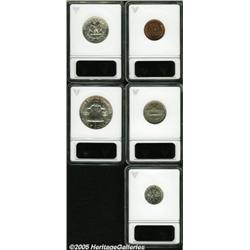 <B>1950 1C Proof Set PR64 to PR65 ANACS.</B></I> The set includes: <B>Cent PR65 Red and Brown,</B></I> orange-red color with lime splashes near the margins, intricately struck, a hair appears to be right of the T in CENT; <B>Nickel PR65 5.5 Steps,</B></I> stone-gray and pale gold colors, well struck and pleasing; <B>Dime PR64,</B></I> nearly brilliant, flashy fields; <B>Quarter PR65,</B></I> dappled sky-blue and pearl-gray color, a beautiful Gem; and a <B>Half Dollar PR64,</B></I> peripheral apricot tints on the reverse, a faint fingerprint near TY in LIBERTY. 5 Coins