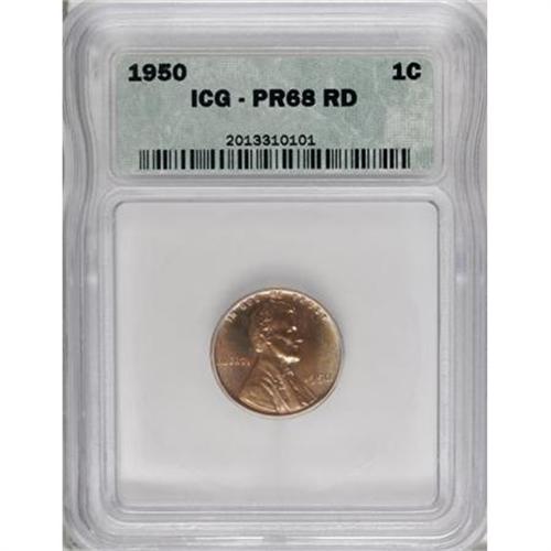 <B>1950 1C PR68 Red ICG.</B></I> . NGC Census: (6/0). PCGS Population (0/0). Mintage: 51,386. Numismedia Wsl. Price for NGC/PCGS coin in PR68: $900. (#3359)<BR><BR><B>Coin Engraver:</B> Victor D. Brenner<BR><BR><b>Shipping:</b> Coins & Currency (<a target="_blank" href="http://www.heritageauctions.com/common/shipping.php">view shipping information</a>)