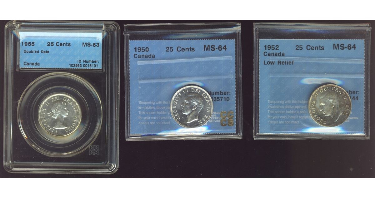 1950 25¢, 1952 LR MS64 & 1955 MS63. Lot of 3 coins all CCCS graded.
