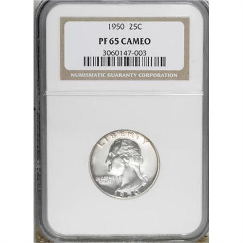 <B>1950 25C PR65 Cameo NGC.</B></I> NGC Census: (34/114). PCGS Population (22/43). Numismedia Wsl. Price for NGC/PCGS coin in PR65: $360. (#85982)<BR><BR><b>Shipping:</b> Coins & Currency (<a target="_blank" href="http://www.heritageauctions.com/common/shipping.php">view shipping information</a>)