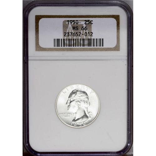 <B>1950<25C> MS66 NGC.</B></I> Snow-white with above average eye appeal, this Washington quarter is boldly struck showing bright, unmarked fields. The devices are impressively preserved with only the most trivial marks apparent under high magnification.
