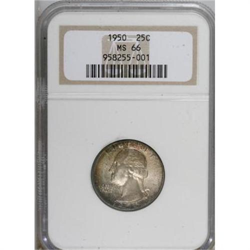 <B>1950 25C MS66 NGC.</B></I> NGC Census: (447/188). PCGS Population (597/29). Mintage: 24,971,512. Numismedia Wsl. Price for NGC/PCGS coin in MS66: $62. (#5841)<BR><BR><B>Coin Engraver:</B> John Flanagan<BR><BR><b>Shipping:</b> Coins & Currency (<a target="_blank" href="http://www.heritageauctions.com/common/shipping.php">view shipping information</a>)