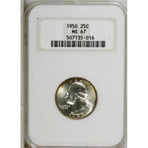 <B>1950 25C MS67 NGC.</B></I> NGC Census: (188/0). PCGS Population (29/0). Mintage: 24,971,512. Numismedia Wsl. Price for NGC/PCGS coin in MS67: $180. (#5841)<BR><BR><B>Coin Engraver:</B> John Flanagan<BR><BR><b>Shipping:</b> Coins & Currency (<a target="_blank" href="http://www.heritageauctions.com/common/shipping.php">view shipping information</a>)