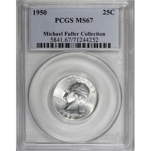 <B>1950 25C MS67 PCGS.</B></I> This Superb Gem is brilliant save for faint yellow-gold patina at the outermost edges. The strike is bold, and the luster is potent. Tied for the finest-certified by either NGC or PCGS (10/07).<BR><I>From The Michael Fuller Collection.</B></I><BR><BR><B>Coin Engraver:</B> John Flanagan<BR><BR><b>Shipping:</b> Coins & Currency (<a target="_blank" href="http://www.heritageauctions.com/common/shipping.php">view shipping information</a>)