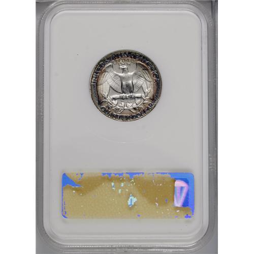 <B>1950<25C> PR66 Cameo NGC.</B></I> Lovely teal blue around the reverse rim and framed in gold at the rims on the obverse. Appealing for the clean surfaces and frosty devices.