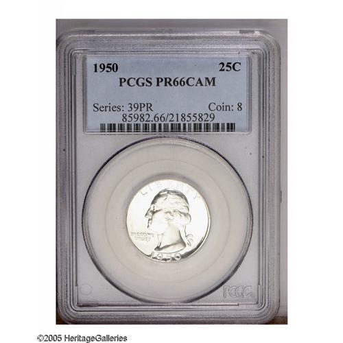 <B>1950<25C> PR66 Cameo PCGS.</B></I> This luminous cameoed proof is nearly devoid of any color, and exhibits sharply struck design elements. The surfaces are impeccably preserved throughout. Population: 21 in 66, 16 finer (11/05).