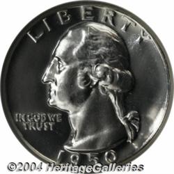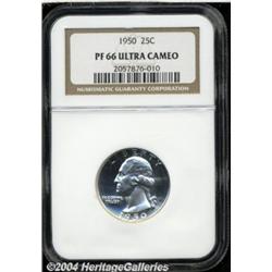 <B>1950<25C> PR66 Deep Cameo NGC.</B></I> An untoned and exceptionally preserved Gem with frosty snow-white devices and deeply reflective fields. The strike is seemingly full, although a few feathers near the eagle's right (facing) leg are attenuated, as made and the result of a polished die. The scarcest of the post World War II proof issues, and few examples possess the pronounced Cameo contrast and the seamless surfaces of this lovely specimen. Population: 2 in 66 as an Ultra Cameo, 3 finer (7/04). <BR><BR><B>Important notice:</B> Heritage usually auctions material at the rate of 200-250 lots per hour. On some occasions eBay Live bid software or the Internet may not be able to keep up with the pace of the auction. We recommend placing a realistic absentee bid now as insurance to avoid disappointment. Occasionally the auctioneer may eliminate or reject an eBay Live bid, and the auctioneer may also reopen a lot after the close of the eBay live bidding (usually because we missed an audience bid), and may reject your bid even if it shows you as the winning bidder. By bidding via eBay Live, you agree that Heritage may award the lot to another bidder at its sole discretion under the circumstances described above or any other reasonable circumstances. Since eBay bids are not shown to us until we open the lot on the floor, we treat those bids just like floor bids. In most cases the floor responds before the eBay bid is presented to us, due to Internet lag time, so for consistency we have made it a policy that floor bids are always considered first over tie eBay live bids. Also please note that all Heritage lots purchased through eBay Live carry a 20% Buyer's Premium. Please make sure you read the Terms and Conditions before you bid. </span></font></tr></table></td></tr></table>