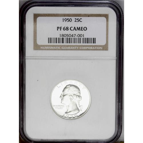 <B>1950<25C> PR68 Cameo NGC.</B></I> The untoned surfaces allow for full appreciation of the strongly contrasted features, particularly on the reverse. Census: 9 in 68 Cameo, none are finer at either service (4/06).