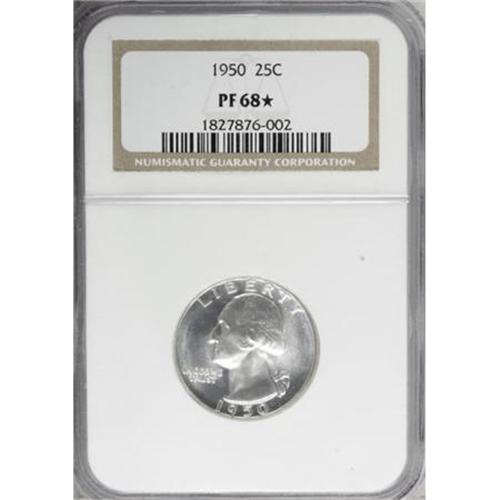 <B>1950 25C PR68 <img border='0' src='http://www.heritagecoins.com/images/star.gif' width=10 height=10> NGC.</B></I> NGC Census: (44/2). PCGS Population (0/0). Mintage: 51,386. Numismedia Wsl. Price for NGC/PCGS coin in PR68: $400. (#5982)<BR><BR><B>Coin Engraver:</B> John Flanagan<BR><BR><b>Shipping:</b> Coins & Currency (<a target="_blank" href="http://www.heritageauctions.com/common/shipping.php">view shipping information</a>\)
