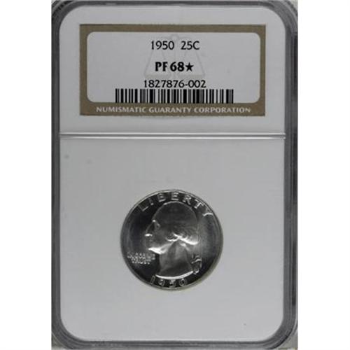 <B>1950 25C PR68 <img border='0' src='http://www.heritagecoins.com/images/star.gif' width=10 height=10> NGC.</B></I> NGC Census: (44/2). PCGS Population (0/0). Mintage: 51,386. Numismedia Wsl. Price for NGC/PCGS coin in PR68: $400. (#5982)<BR><BR><B>Coin Engraver:</B> John Flanagan<BR><BR><b>Shipping:</b> Coins & Currency (<a target="_blank" href="http://www.heritageauctions.com/common/shipping.php">view shipping information</a>)