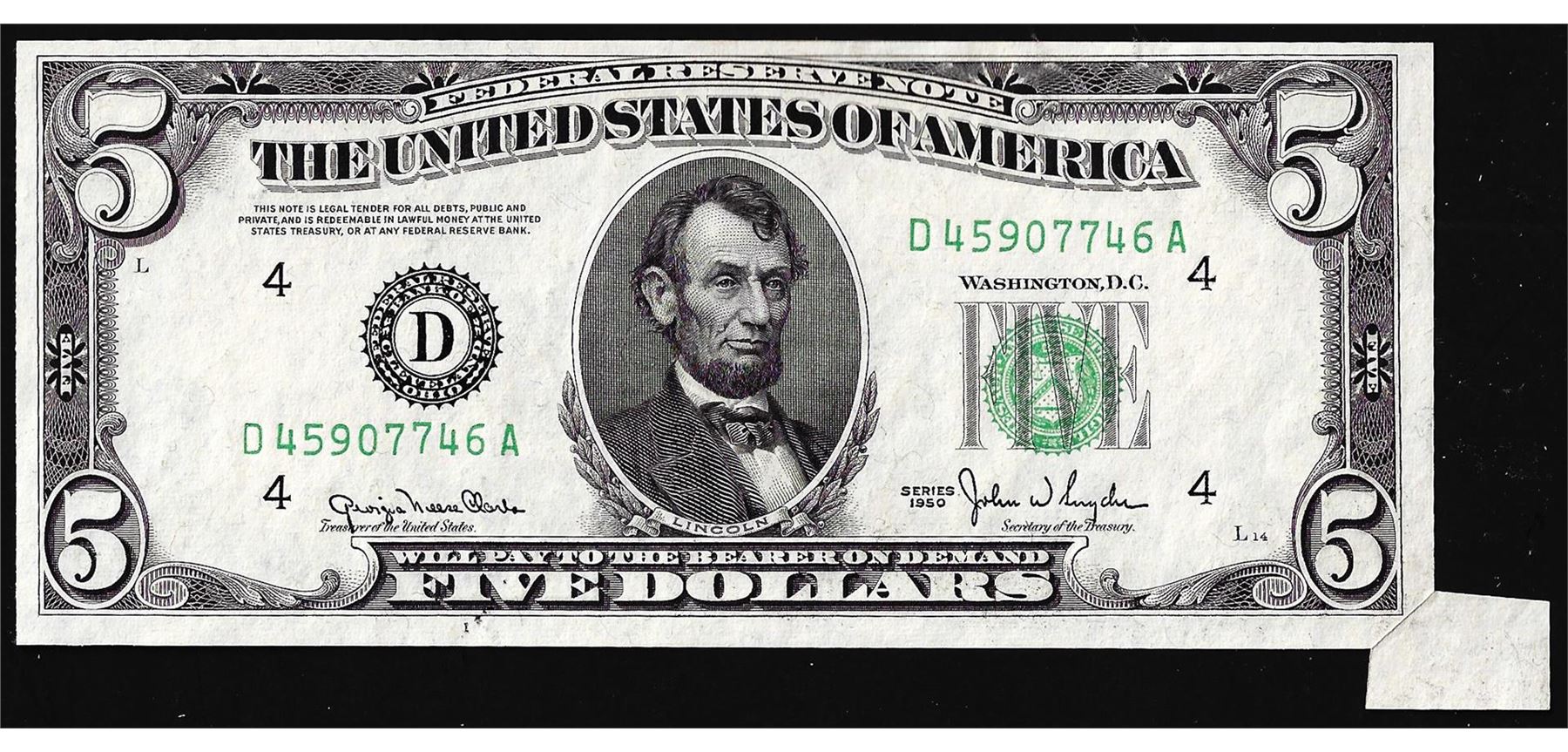 One 1950 $5 Federal Reserve Butterfly Fold Error Note.