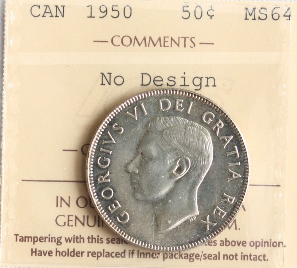 1950 50¢ "No Design" ICCS Choice Mint State-64, Blast white example.