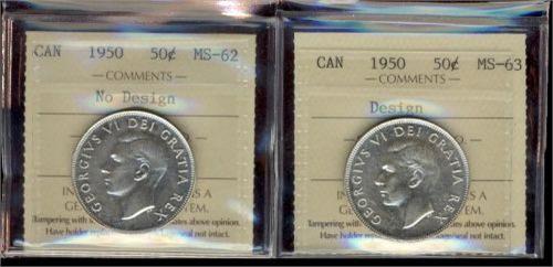1950 50¢, lot of two ICCS graded coins, No Des in MS62 and the Design in MS63. Both white and lustrous.