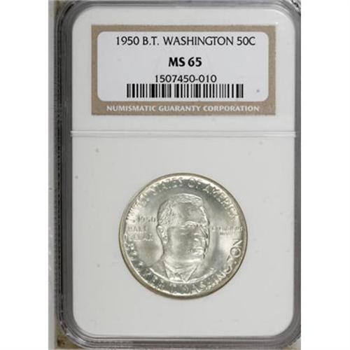 <B>1950 50C Booker T. Washington MS65 NGC.</B></I> NGC Census: (241/121). PCGS Population (419/123). Mintage: 6,004. Numismedia Wsl. Price for NGC/PCGS coin in MS65: $58. (#9420)<BR><BR><b>Shipping:</b> Coins & Currency (<a target="_blank" href="http://www.heritageauctions.com/common/shipping.php">view shipping information</a>)
