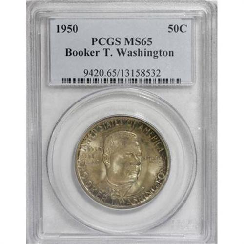 <B>1950 50C Booker T. Washington MS65 PCGS.</B></I> PCGS Population (416/111). NGC Census: (231/119). Mintage: 6,004. Numismedia Wsl. Price for NGC/PCGS coin in MS65: $58. (#9420)<BR><BR><b>Shipping:</b> Coins & Currency (<a target="_blank" href="http://www.heritageauctions.com/common/shipping.php">view shipping information</a>)