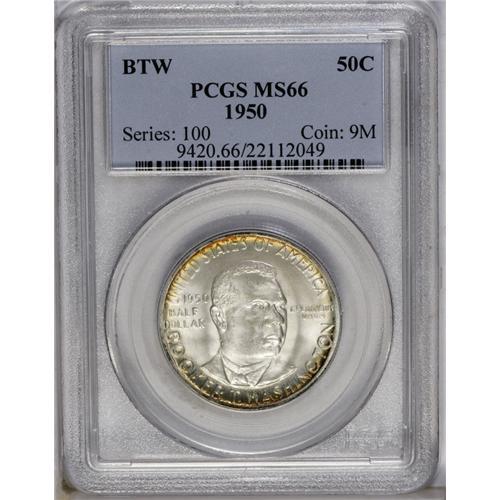 <B>1950<50C> Booker T. Washington MS66 PCGS.</B></I> Bronze toning at the periphery surrounds the pearl-gray centers of this subtly lustrous and well struck coin. A few faint milling marks are noted on the bust.