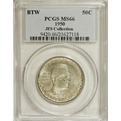 <B>1950 50C Booker T. Washington MS66 PCGS.</B></I> Ex: JFS Collection. The 1950 Philadelphia and Denver issues suffered much the same fate as their 1949 counterparts. Even with mintages of only 12,000 pieces plus assay coins, half the original production went unsold. This strongly lustrous and pleasing Premium Gem displays light silver-gray patina over much of the surfaces, while a hint of scarlet is noted on the left obverse rim. PCGS has graded only two finer pieces (4/07).<BR><I>From The Cary & Cheryl Porter Collection.</B></I><BR><BR><b>Shipping:</b> Coins & Currency (<a target="_blank" href="http://www.heritageauctions.com/common/shipping.php">view shipping information</a>)