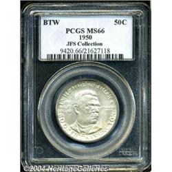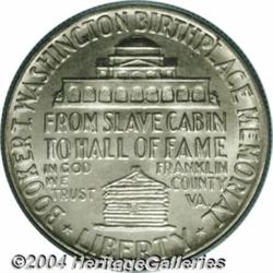 <B>1950<50C> Booker T. Washington MS66 PCGS.</B></I> Both sides are silver-gray in appearance save for the slightest hint of delicate opaque iridescence. There are no marks of consequence, as one should expect for the premium quality Gem grade. Population: 69 in 66, 1 finer (3/04).<BR><I>Ex: FUN Signature Sale (Heritage, 1/01), as part of lot 9197, which realized $1,035.</B></I><BR><I>From the JFS Collection, the #1 All-Time PCGS Registry Set.</B></I> <BR><BR><B>Important notice:</B> Heritage usually auctions material at the rate of 200-250 lots per hour. On some occasions eBay Live bid software or the Internet may not be able to keep up with the pace of the auction. We recommend placing a realistic absentee bid now as insurance to avoid disappointment. Occasionally the auctioneer may eliminate or reject an eBay Live bid, and the auctioneer may also reopen a lot after the close of the eBay live bidding (usually because we missed an audience bid), and may reject your bid even if it shows you as the winning bidder. By bidding via eBay Live, you agree that Heritage may award the lot to another bidder at its sole discretion under the circumstances described above or any other reasonable circumstances. Since eBay bids are not shown to us until we open the lot on the floor, we treat those bids just like floor bids. In most cases the floor responds before the eBay bid is presented to us, due to Internet lag time, so for consistency we have made it a policy that floor bids are always considered first over tie eBay live bids. Also please note that all Heritage lots purchased through eBay Live carry a 20% Buyer's Premium. Please make sure you read the Terms and Conditions before you bid. </span></font></tr></table></td></tr></table>