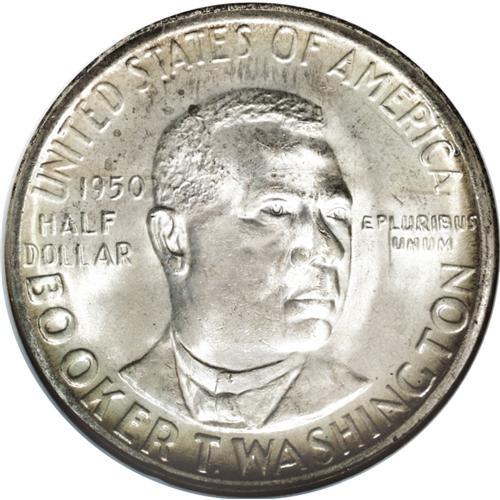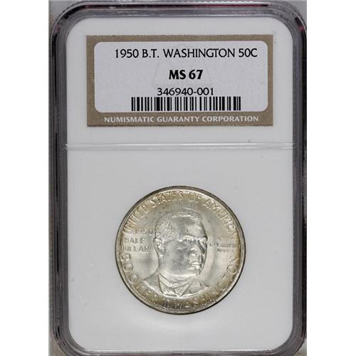 <B>1950<50C> Booker T. Washington MS67 NGC.</B></I> This lovely Superb Gem has a light apricot-gold patina and only the most trivial of abrasions on the cheek of Booker T. Washington. A lustrous and beautiful piece, one of only seven coins so graded at NGC, with none finer (7/06).