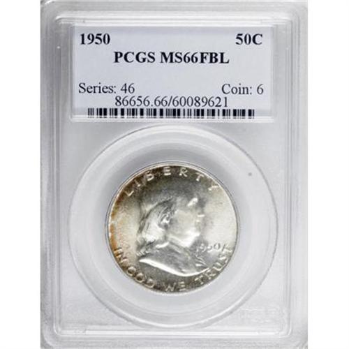 <B>1950 50C MS66 Full Bell Lines PCGS.</B></I> PCGS Population (148/3). NGC Census: (72/4). Numismedia Wsl. Price for NGC/PCGS coin in MS66: $625. (#86656)<BR><BR><b>Shipping:</b> Coins & Currency (<a target="_blank" href="http://www.heritageauctions.com/common/shipping.php">view shipping information</a>)