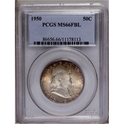 <B>1950<50C> MS66 Full Bell Lines PCGS.</B></I> The bell lines, as well as most of the other device details, are full, and the surfaces remain refreshingly original. While the centers are mostly untoned, the margins have acquired a lovely multicolored patina that was likely a result of years of album storage. PCGS has deemed only two examples finer (3/06). <BR><BR><B>Important notice:</B> Heritage usually auctions material at the rate of 200-250 lots per hour. On some occasions eBay Live bid software or the Internet may not be able to keep up with the pace of the auction. We recommend placing a realistic absentee bid now as insurance to avoid disappointment. Occasionally the auctioneer may eliminate or reject an eBay Live bid, and the auctioneer may also reopen a lot after the close of the eBay live bidding (usually because we missed an audience bid), and may reject your bid even if it shows you as the winning bidder. By bidding via eBay Live, you agree that Heritage may award the lot to another bidder at its sole discretion under the circumstances described above or any other reasonable circumstances. Since eBay bids are not shown to us until we open the lot on the floor, we treat those bids just like floor bids. In most cases the floor responds before the eBay bid is presented to us, due to Internet lag time, so for consistency we have made it a policy that floor bids are always considered first over tie eBay live bids. Also please note that all Heritage lots purchased through eBay Live carry a 20% Buyer's Premium. Please make sure you read the Terms and Conditions before you bid. This lot is being auctioned in conjunction with a live floor auction by Heritage Galleries & Auctioneers. All final auction and invoice information will be supplied by Heritage Galleries & Auctioneers, and all other information should be considered preliminary. Lot:3085 <BR><BR><B>Winning Notification and Billing:</B> After the FINAL session in this auction is complete, Heritage will send e-mail and snail mail invoices. This process normally takes several days. All final auction and invoice information will be supplied by Heritage Galleries & Auctioneers, and all other information should be considered preliminary. <BR><BR>This auction will be conducted on a live auction floor and over the Internet through eBay Live. If you choose to place an absentee bid, please take a moment to <font color='#0000ff'><u><a href='http://pages.ebay.com/liveauctions/help/before/laabsentee.html'>learn how eBay Live absentee bidding works</a></u></font><font color='#000000'>