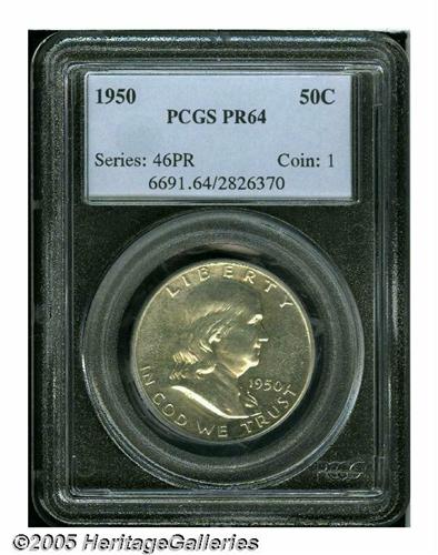 <B>1950<50C> PR64 PCGS.</B></I> Fully struck with some milky toning in the fields, which remain nicely reflective, and a few faint handling marks near the center of each side.