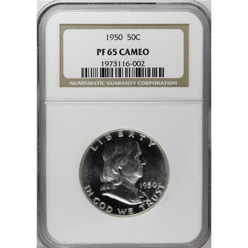 <B>1950 50C PR65 Cameo NGC.</B></I> Deeply mirrored and essentially untoned with distinct contrast that is stronger on the reverse. A small and scarcely distracting spot of milky patina is noted above the eagle.<BR><BR><b>Shipping:</b> Coin/Currency (<a target="_blank" href="http://www.heritageauctions.com/common/shipping.php">view shipping information</a>)