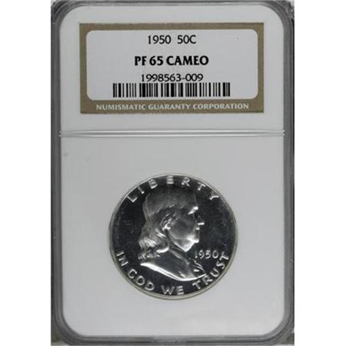 <B>1950 50C PR65 Cameo NGC.</B></I> Moderate contrast and minimally toned fields contribute to the outstanding eye appeal of this gleaming Gem. A wonderful representative of the first proof Franklin half issue.<BR><BR><b>Shipping:</b> Coins & Currency (<a target="_blank" href="http://www.heritageauctions.com/common/shipping.php">view shipping information</a>)