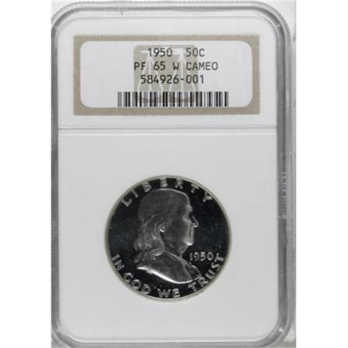 <B>1950 50C PR65 W Cameo NGC.</B></I> Subtle but definite cameo contrast is noted on each side of this untoned and fully brilliant reflective Gem proof. A few wispy hairlines are noted, but the overall appeal is considerable. A lovely representative of this first-year issue in the proof Franklin half dollar that is always in demand from collectors.<BR><BR><b>Shipping:</b> Coins & Currency (<a target="_blank" href="http://www.heritageauctions.com/common/shipping.php">view shipping information</a>)