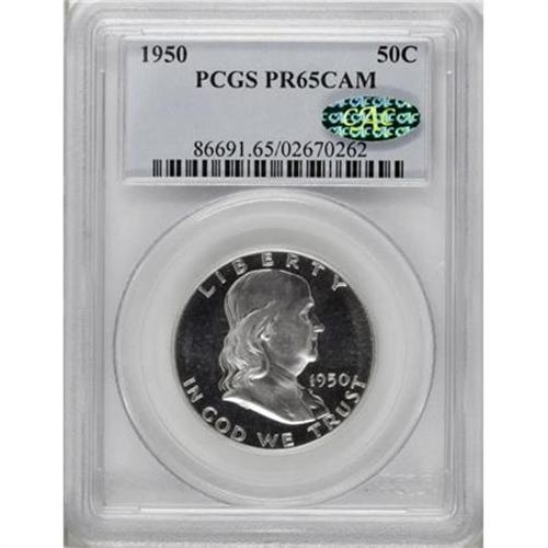 <B>1950 50C PR65 Cameo PCGS. CAC.</B></I> Pleasing contrast for this initial proof Franklin half dollar issue, with moderately frosted, sharply struck devices and strong mirrors. Excellent surface quality. Population: 70 in 65 Cameo, 22 finer (3/08).<BR><BR><b>Shipping:</b> Coins & Currency (<a target="_blank" href="http://www.heritageauctions.com/common/shipping.php">view shipping information</a>)