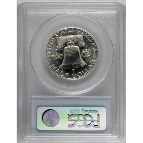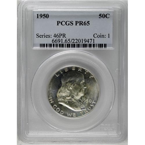 <B>1950<50C> PR65 PCGS.</B></I> After an eight-year hiatus from proof production, the Philadelphia Mint resumed striking proof sets in 1950. Many of these coins were produced with a moderately mirrored finish, this being one such example. Splashes of milky-golden patina are seen particularly over the obverse.