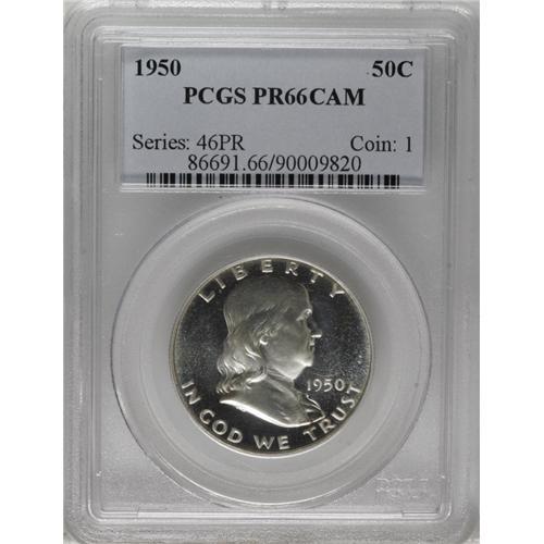 <B>1950 50C PR66 Cameo PCGS.</B></I> The coiners of proofs in 1950 struggled to recapture an art lost for eight years, and few pieces from that first year displayed any sort of contrast. This pretty Premium Gem is one of the exceptions. A hint of gold over each side only accents the eye appeal and contrast, which is perhaps stronger on the reverse. Population: 20 in 66 Cameo, 2 finer (11/06).<BR><BR><b>Shipping:</b> Coin/Currency (<a target="_blank" href="http://www.heritageauctions.com/common/shipping.php">view shipping information</a>)