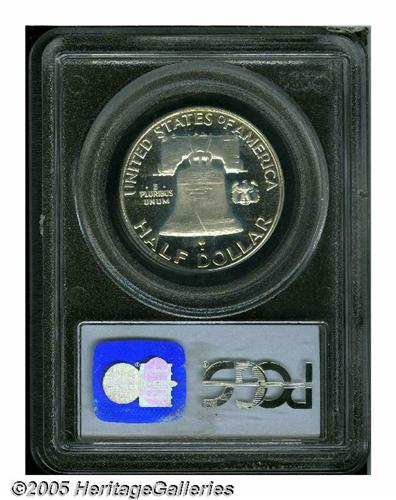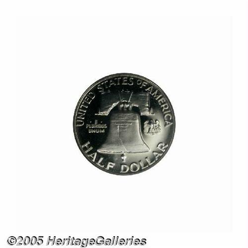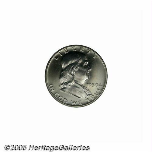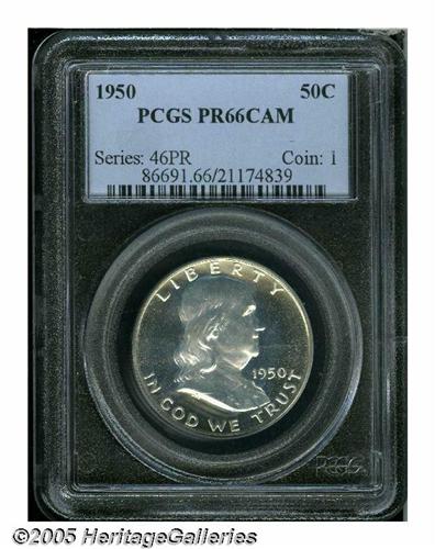 <B>1950<50C> PR66 Cameo PCGS.</B></I> The frosty devices have imposing cameo contrast against the deeply mirrored fields. One of several Gem or better examples cameos in this year ANA Sale, quite an extensive offering for this first year proof issue. Population: 20 in 66 Cameo, 2 finer (6/05).