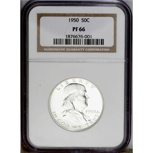 <B>1950<50C> PR66 NGC.</B></I> Blast silver-white and nearly pristine. Only the smallest contact marks are visible under a strong glass. From a proof mintage of about 51,000 coins.<BR><I>From The Manna Collection.</B></I> <BR><BR><B>Important notice:</B> Heritage usually auctions material at the rate of 200-250 lots per hour. On some occasions eBay Live bid software or the Internet may not be able to keep up with the pace of the auction. We recommend placing a realistic absentee bid now as insurance to avoid disappointment. Occasionally the auctioneer may eliminate or reject an eBay Live bid, and the auctioneer may also reopen a lot after the close of the eBay live bidding (usually because we missed an audience bid), and may reject your bid even if it shows you as the winning bidder. By bidding via eBay Live, you agree that Heritage may award the lot to another bidder at its sole discretion under the circumstances described above or any other reasonable circumstances. Since eBay bids are not shown to us until we open the lot on the floor, we treat those bids just like floor bids. In most cases the floor responds before the eBay bid is presented to us, due to Internet lag time, so for consistency we have made it a policy that floor bids are always considered first over tie eBay live bids. Also please note that all Heritage lots purchased through eBay Live carry a 20% Buyer's Premium. Please make sure you read the Terms and Conditions before you bid. This lot is being auctioned in conjunction with a live floor auction by Heritage Galleries & Auctioneers. All final auction and invoice information will be supplied by Heritage Galleries & Auctioneers, and all other information should be considered preliminary. Lot:3141 <BR><BR><B>Winning Notification and Billing:</B> After the FINAL session in this auction is complete, Heritage will send e-mail and snail mail invoices. This process normally takes several days. All final auction and invoice information will be supplied by Heritage Galleries & Auctioneers, and all other information should be considered preliminary. <BR><BR>This auction will be conducted on a live auction floor and over the Internet through eBay Live. If you choose to place an absentee bid, please take a moment to <font color='#0000ff'><u><a href='http://pages.ebay.com/liveauctions/help/before/laabsentee.html'>learn how eBay Live absentee bidding works</a></u></font><font color='#000000'>