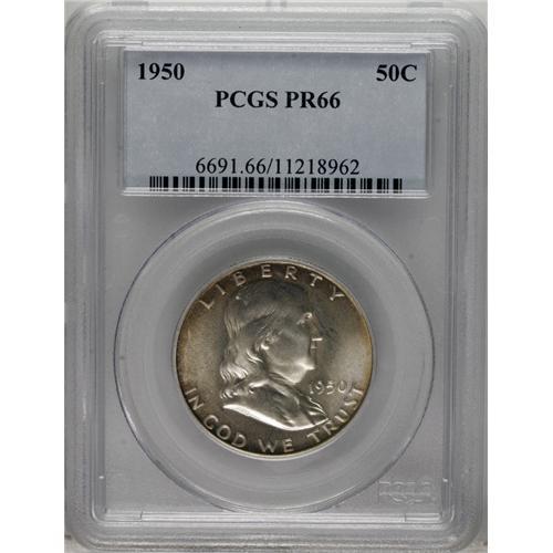 <B>1950 50C PR66 PCGS.</B></I> From the last Walking Liberty half mintage of 21,120 in 1942, the first Franklin half proof emission grew to exceed 50,000 pieces. A ring of gold graces the obverse, while the reverse shows delicate tinges of ice-blue and lilac. A sharp and appealing coin.<BR><BR><b>Shipping:</b> Coins & Currency (<a target="_blank" href="http://www.heritageauctions.com/common/shipping.php">view shipping information</a>)