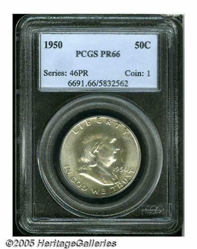 <B>1950<50C> PR66 PCGS.</B></I> Silvery surfaces display a couple of light splashes of gold on the obverse. Well struck, with no significant marks. Population: 337 in 66, 23 finer (5/05).