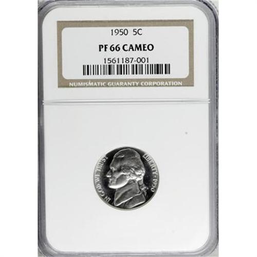 <B>1950 5C PR66 Cameo NGC.</B></I> NGC Census: (60/52). PCGS Population (66/33). Numismedia Wsl. Price for NGC/PCGS coin in PR66: $220. (#84182)<BR><BR><b>Shipping:</b> Coins & Currency (<a target="_blank" href="http://www.heritageauctions.com/common/shipping.php">view shipping information</a>\)