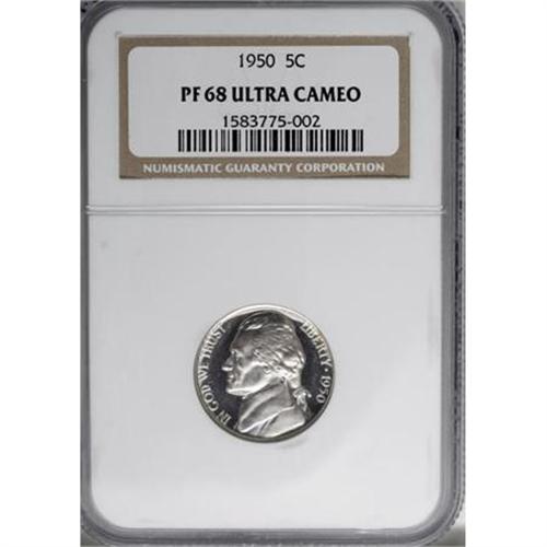 <B>1950 5C PR68 Ultra Cameo NGC.</B></I> Decisively struck with gleaming, faintly iridescent fields and richly frosted devices that combine for excellent contrast. An amazing and absolutely top-notch survivor from the first proof Jefferson nickel issue since World War II. Census: 1 in 68 Ultra Cameo, 0 finer (10/07).<BR><BR><b>Shipping:</b> Coins & Currency (<a target="_blank" href="http://www.heritageauctions.com/common/shipping.php">view shipping information</a>)