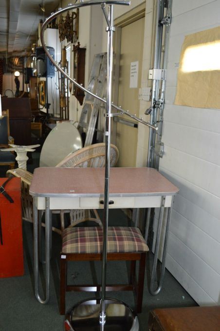 1950/60's arborite baker's table with single drawer, a walnut framed vanity bench and a modern chrome retail clothing display rack