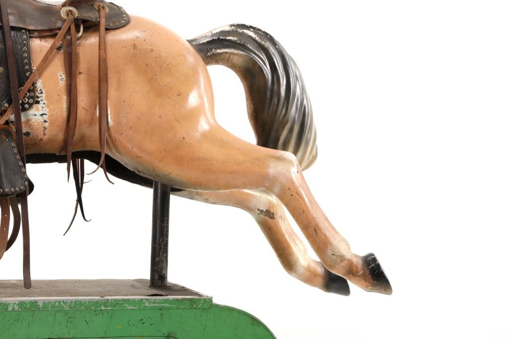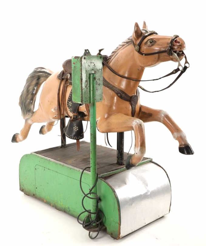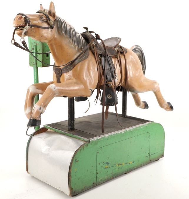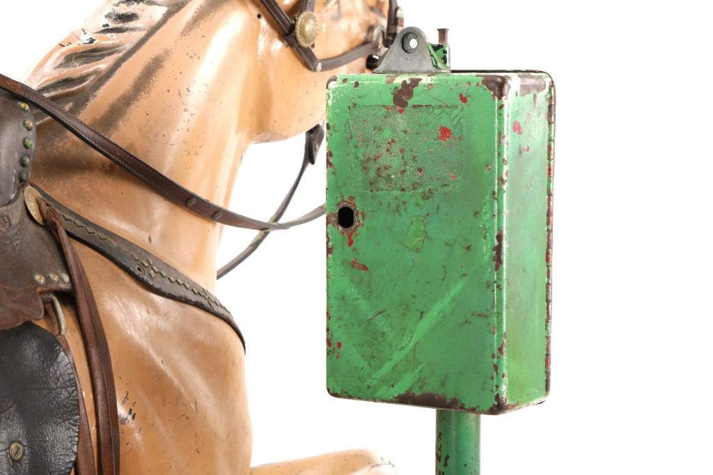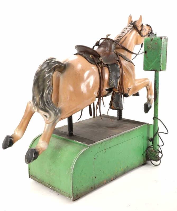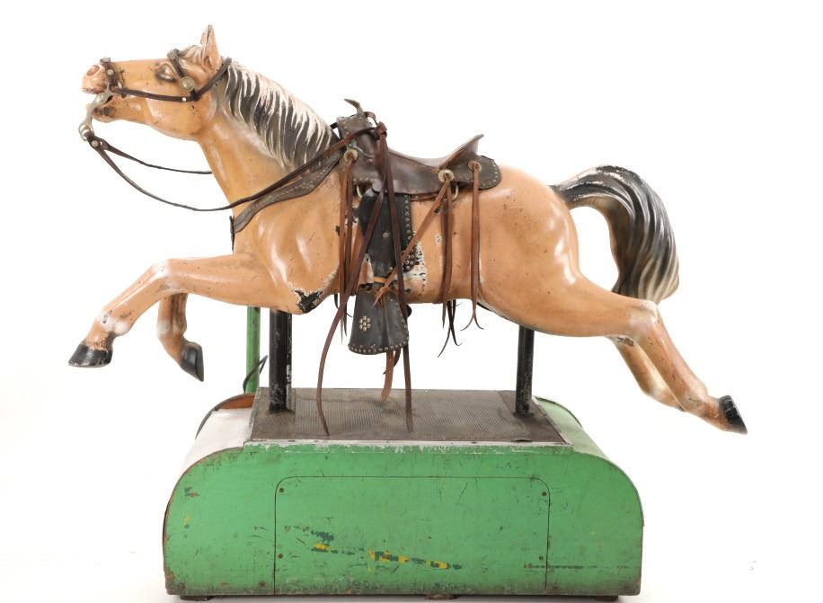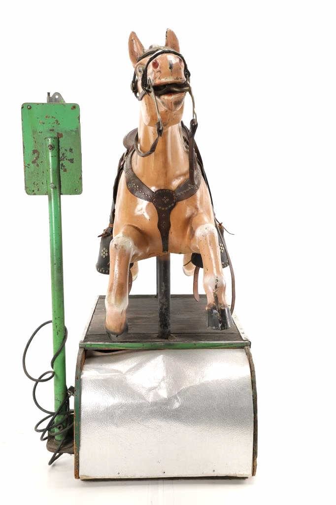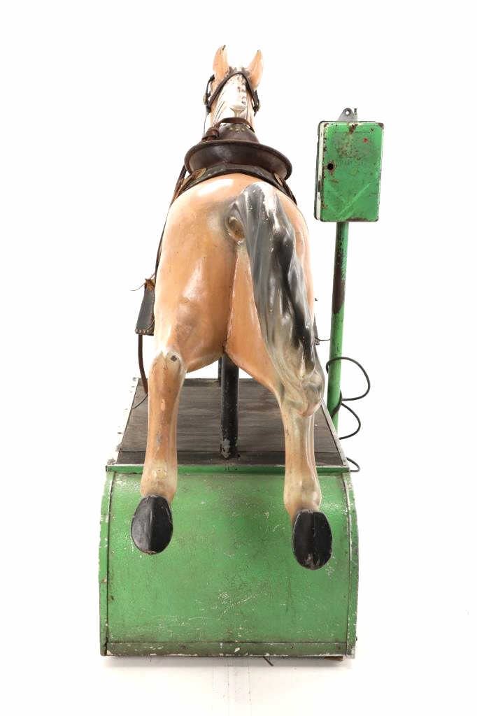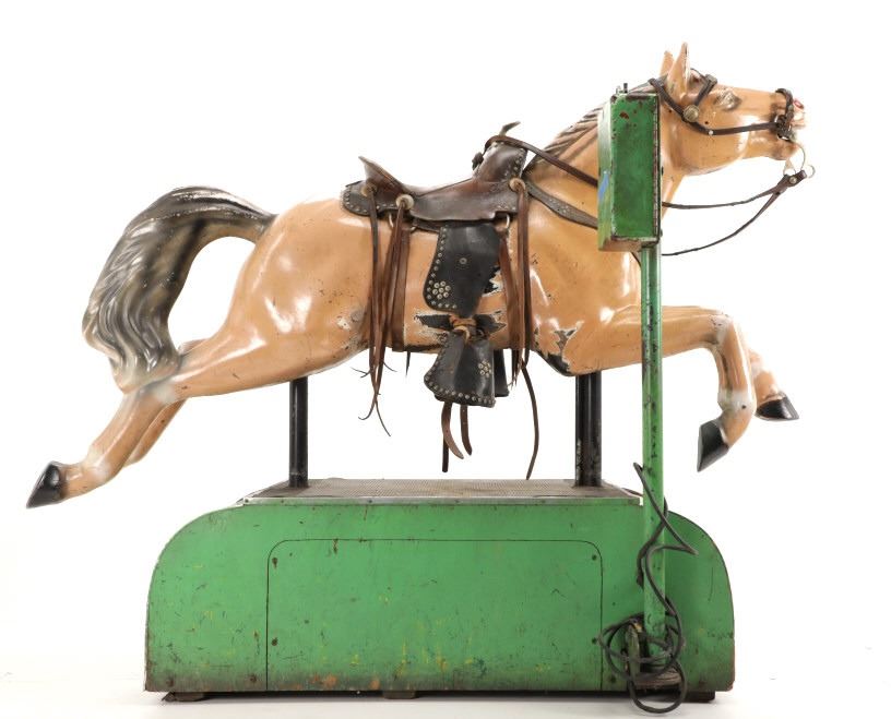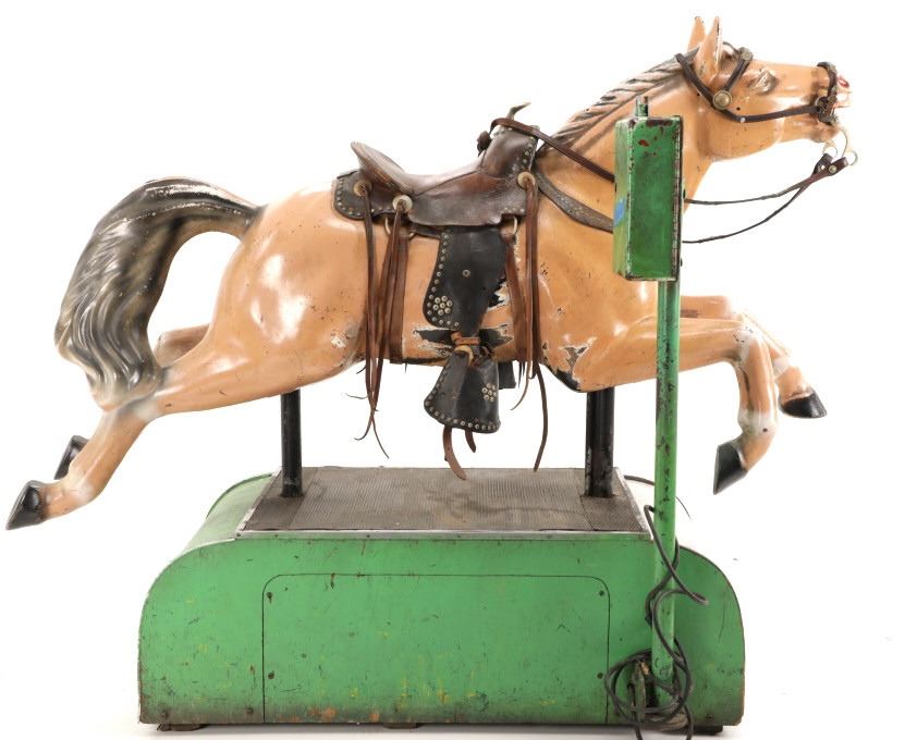 Featured in this lot is a 1950-1960s "Sandy Horse" coin operated mechanical ride. The ride appears to work. James Otto Hahs created the first mechanical horse in 1931, when he constructed one as a Christmas present for his children. The ride was well-liked by the kids, and he immediately saw the necessity to market his innovation. As the original version's wood-carved horses proved to be excessively heavy, Hahs switched to casting aluminum models. The Hahs Gaited Mechanical Horse was recognized for its design and creation in 1932. By the 1950s, "kiddie rides" were one of the fastest-growing industries in America. This horse shows a green metal base with a black rubber rubber slip mat on top and sheet metal on the front and back end of the base. The horse itself shows a beige base color with a black mane and tail. It has a genuine leather saddle, bridle and martingale and features wood and leather stirrups. On one side of the ride is a green painted coin bank where you pay for the ride. The lettering has been worn off and only shows remnants of yellow paint. The ride is in good working order. The horse shows good condition for its vintage age, but it has areas of worn paint and wear from years of use. The ride measures 72" L x 30 1/2" W x 56 1/4" H.* The ride will function when a small metal coin catch is activated when the door is open.