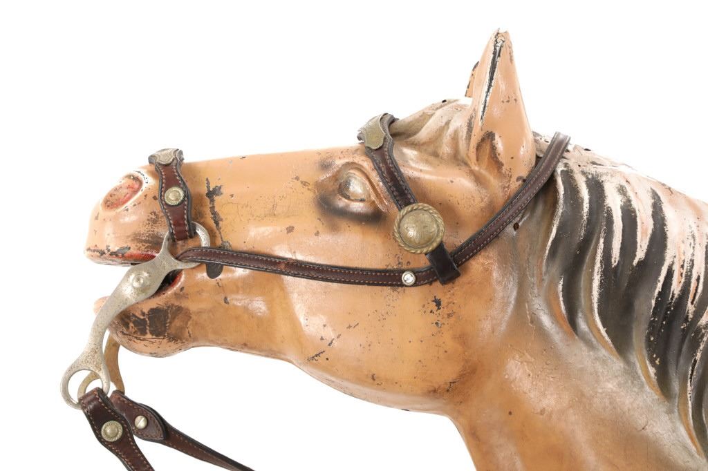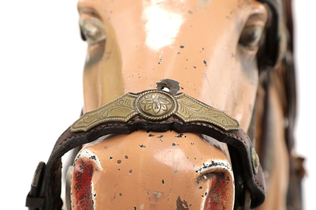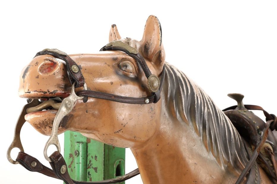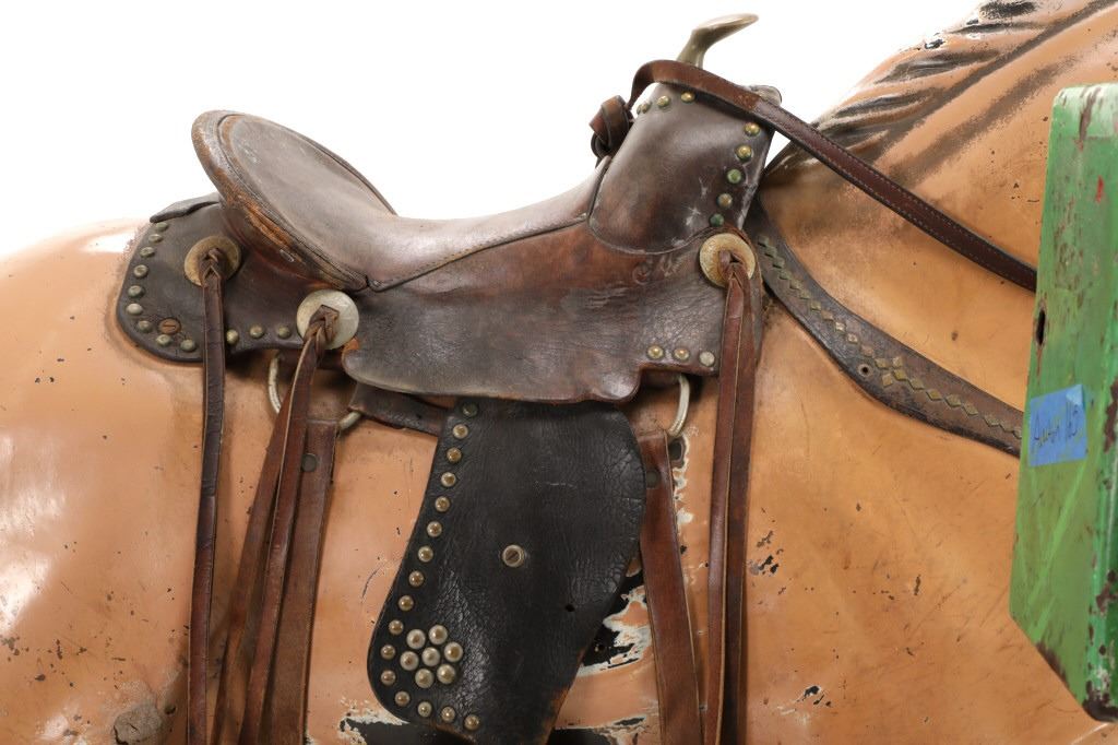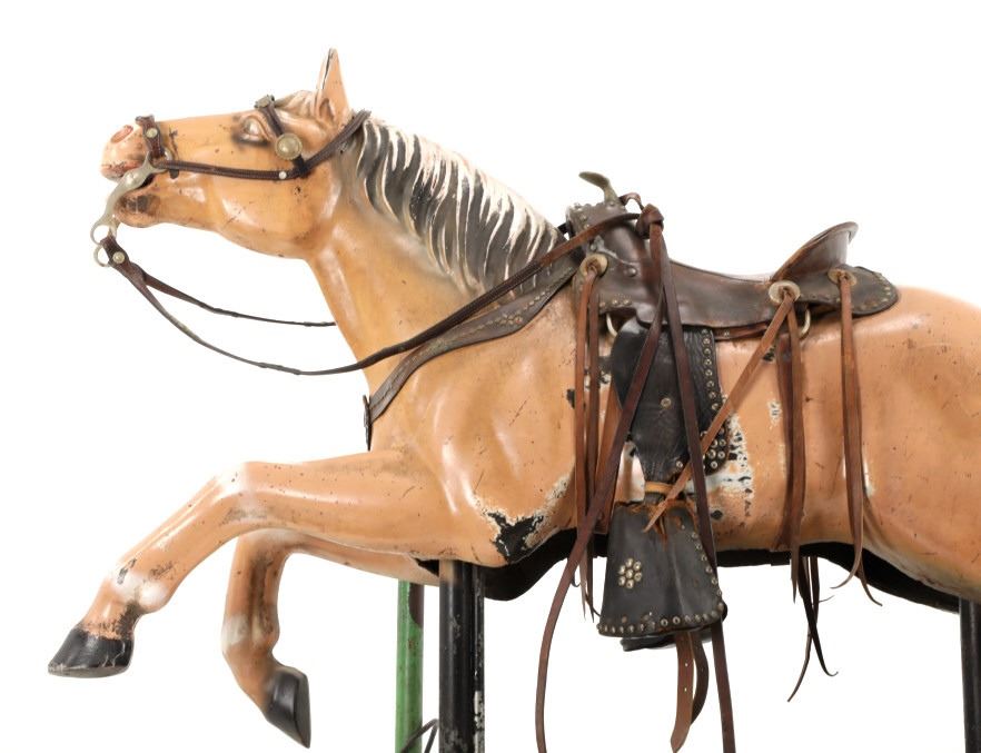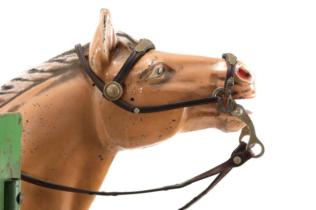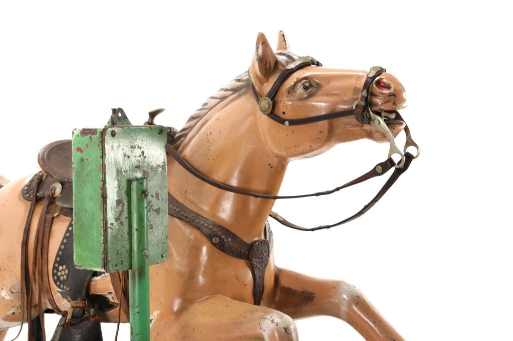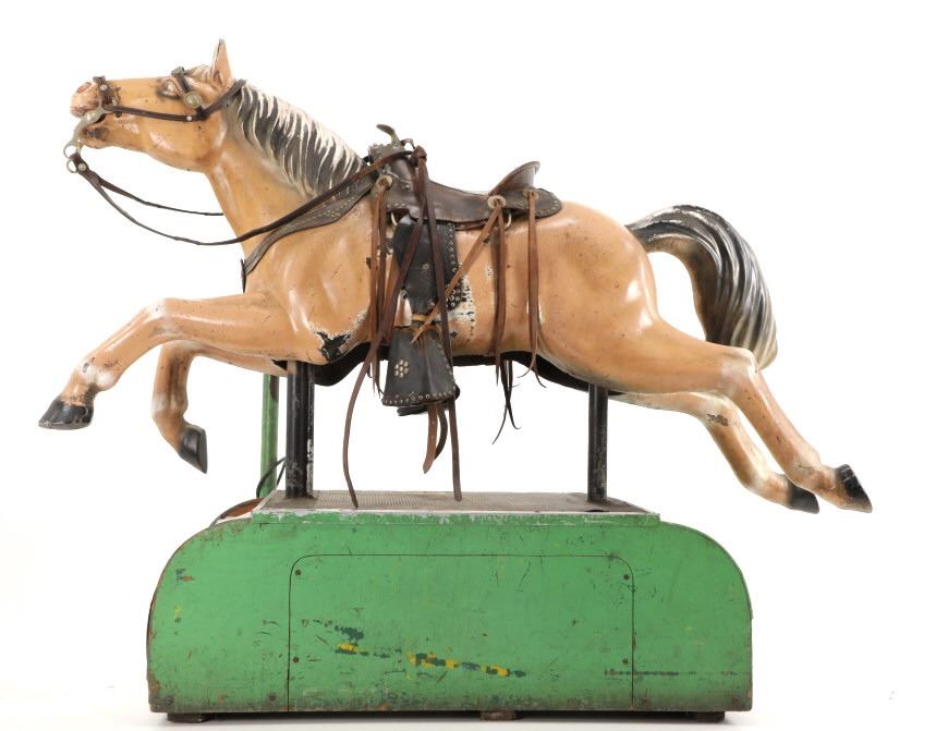 Featured in this lot is a 1950-1960s "Sandy Horse" coin operated mechanical ride. The ride appears to work. James Otto Hahs created the first mechanical horse in 1931, when he constructed one as a Christmas present for his children. The ride was well-liked by the kids, and he immediately saw the necessity to market his innovation. As the original version's wood-carved horses proved to be excessively heavy, Hahs switched to casting aluminum models. The Hahs Gaited Mechanical Horse was recognized for its design and creation in 1932. By the 1950s, "kiddie rides" were one of the fastest-growing industries in America. This horse shows a green metal base with a black rubber rubber slip mat on top and sheet metal on the front and back end of the base. The horse itself shows a beige base color with a black mane and tail. It has a genuine leather saddle, bridle and martingale and features wood and leather stirrups. On one side of the ride is a green painted coin bank where you pay for the ride. The lettering has been worn off and only shows remnants of yellow paint. The ride is in good working order. The horse shows good condition for its vintage age, but it has areas of worn paint and wear from years of use. The ride measures 72" L x 30 1/2" W x 56 1/4" H.* The ride will function when a small metal coin catch is activated when the door is open.