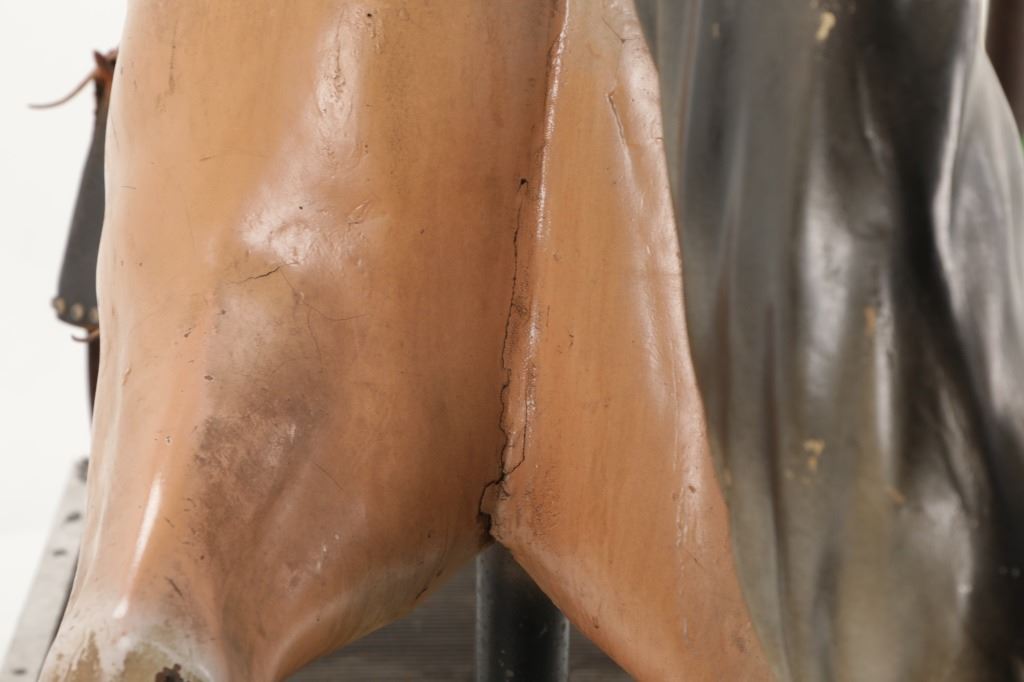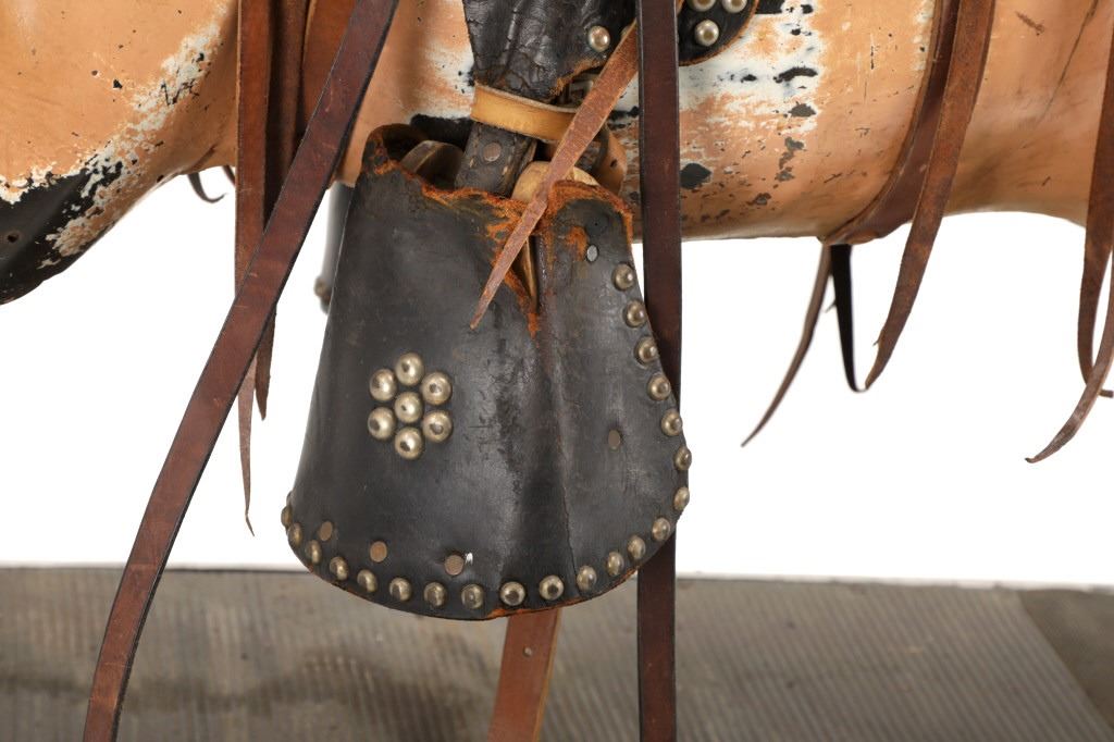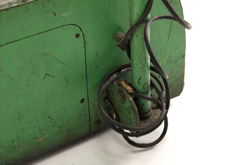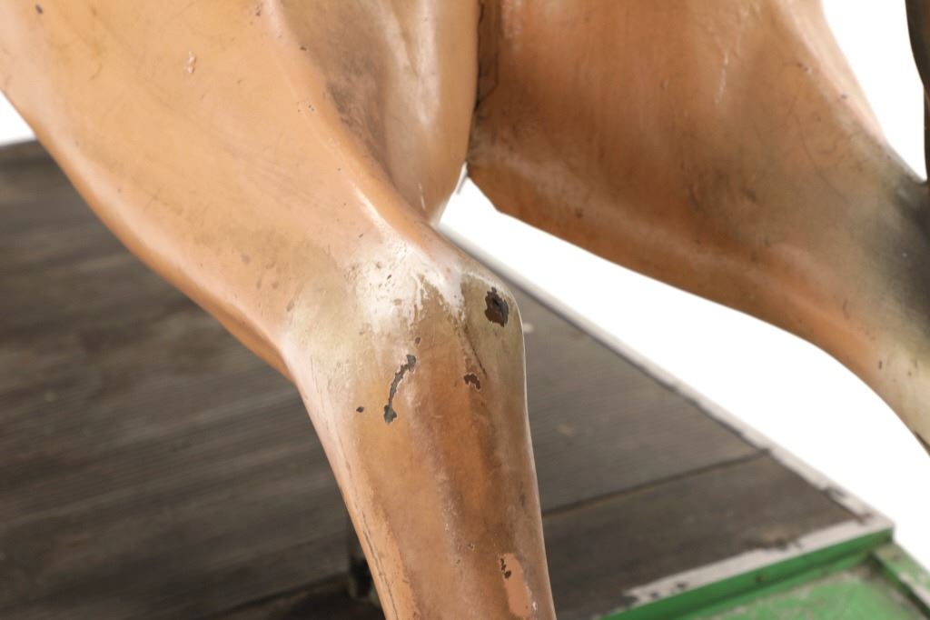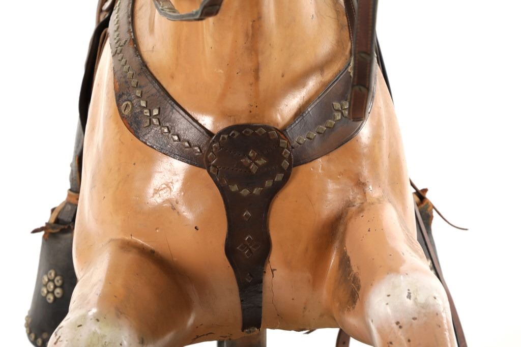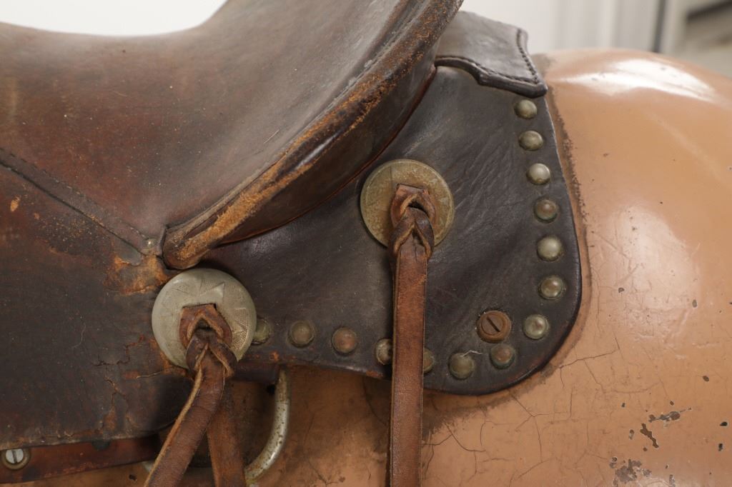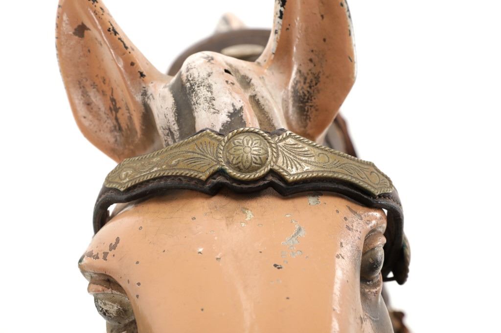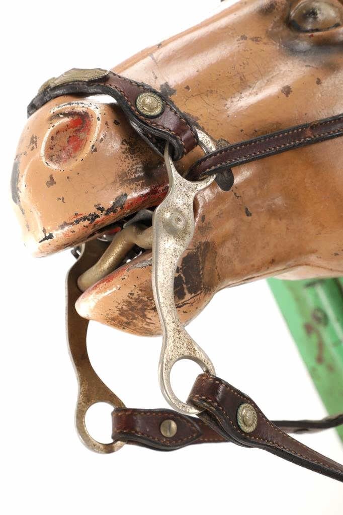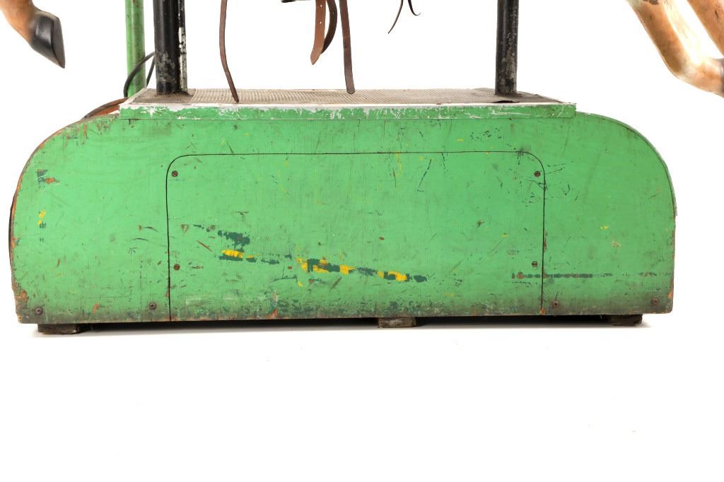 Featured in this lot is a 1950-1960s "Sandy Horse" coin operated mechanical ride. The ride appears to work. James Otto Hahs created the first mechanical horse in 1931, when he constructed one as a Christmas present for his children. The ride was well-liked by the kids, and he immediately saw the necessity to market his innovation. As the original version's wood-carved horses proved to be excessively heavy, Hahs switched to casting aluminum models. The Hahs Gaited Mechanical Horse was recognized for its design and creation in 1932. By the 1950s, "kiddie rides" were one of the fastest-growing industries in America. This horse shows a green metal base with a black rubber rubber slip mat on top and sheet metal on the front and back end of the base. The horse itself shows a beige base color with a black mane and tail. It has a genuine leather saddle, bridle and martingale and features wood and leather stirrups. On one side of the ride is a green painted coin bank where you pay for the ride. The lettering has been worn off and only shows remnants of yellow paint. The ride is in good working order. The horse shows good condition for its vintage age, but it has areas of worn paint and wear from years of use. The ride measures 72" L x 30 1/2" W x 56 1/4" H.* The ride will function when a small metal coin catch is activated when the door is open.