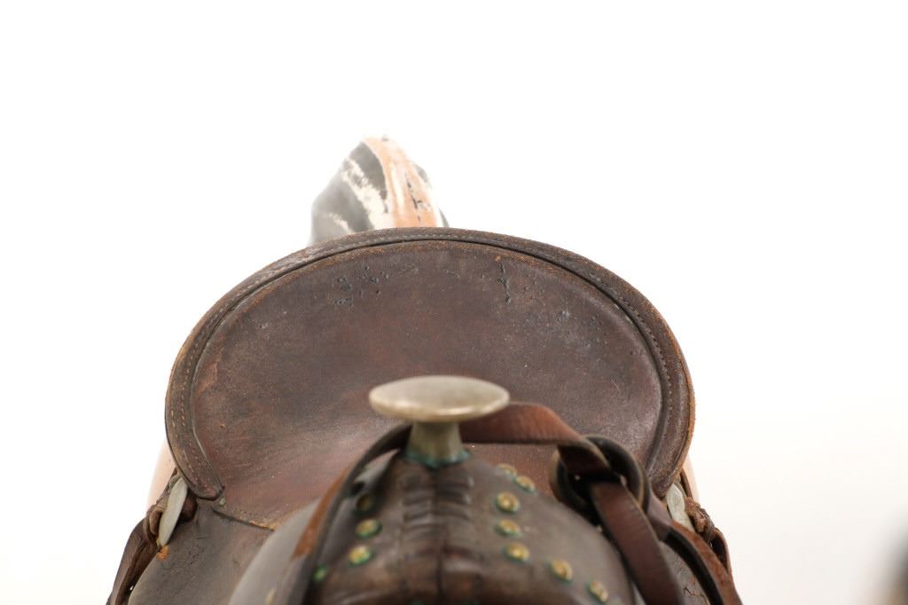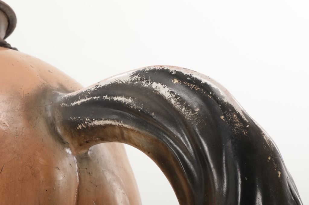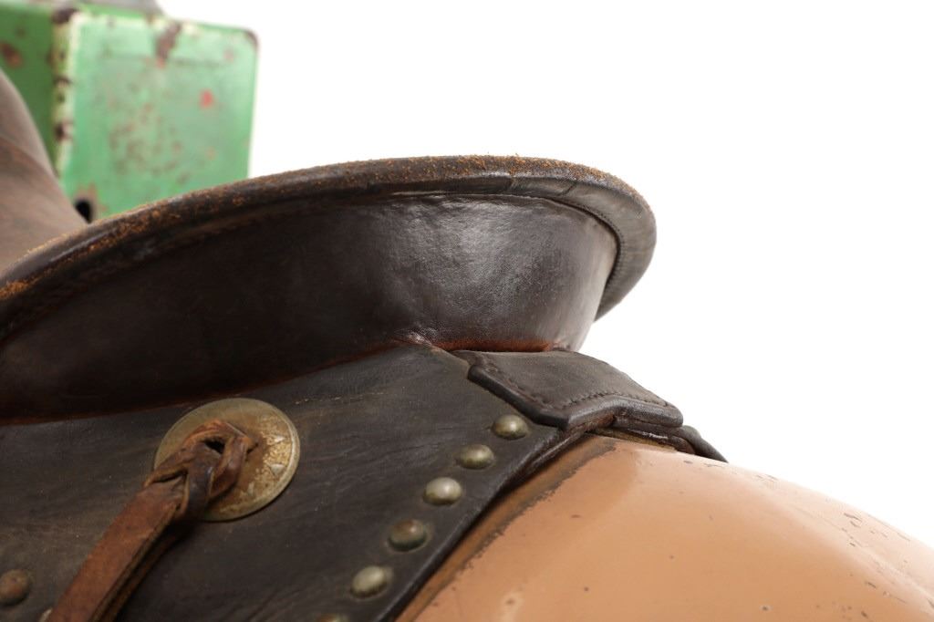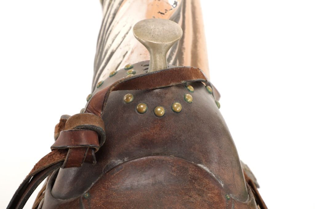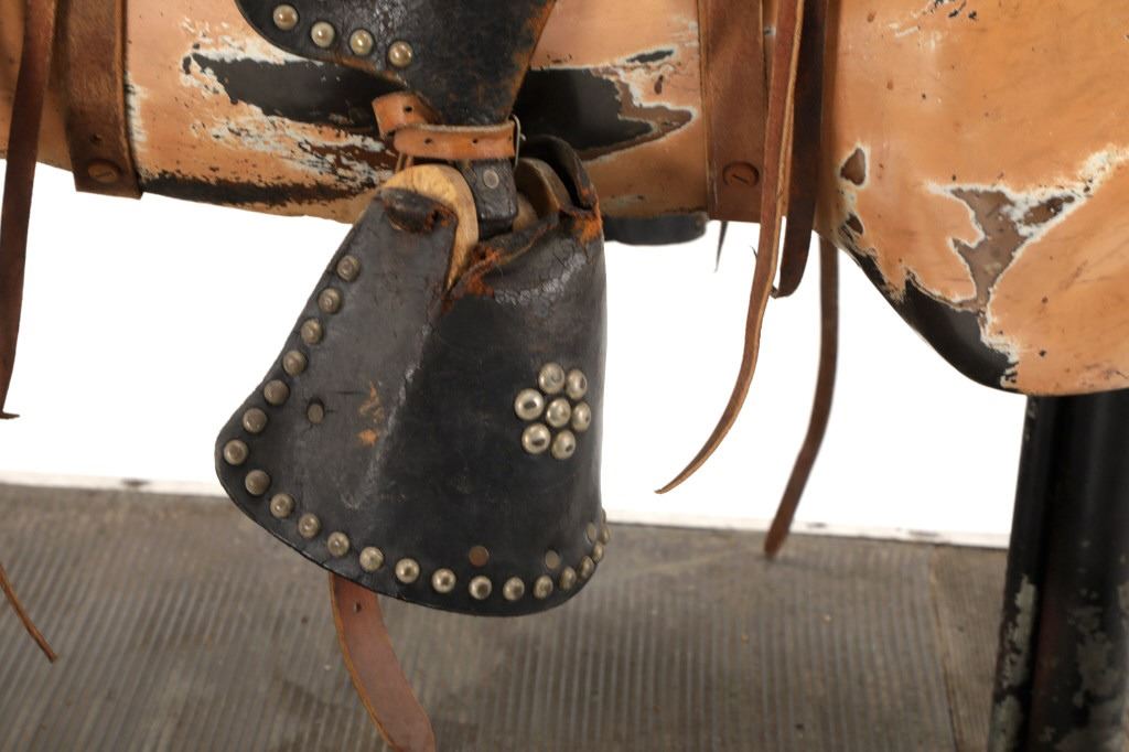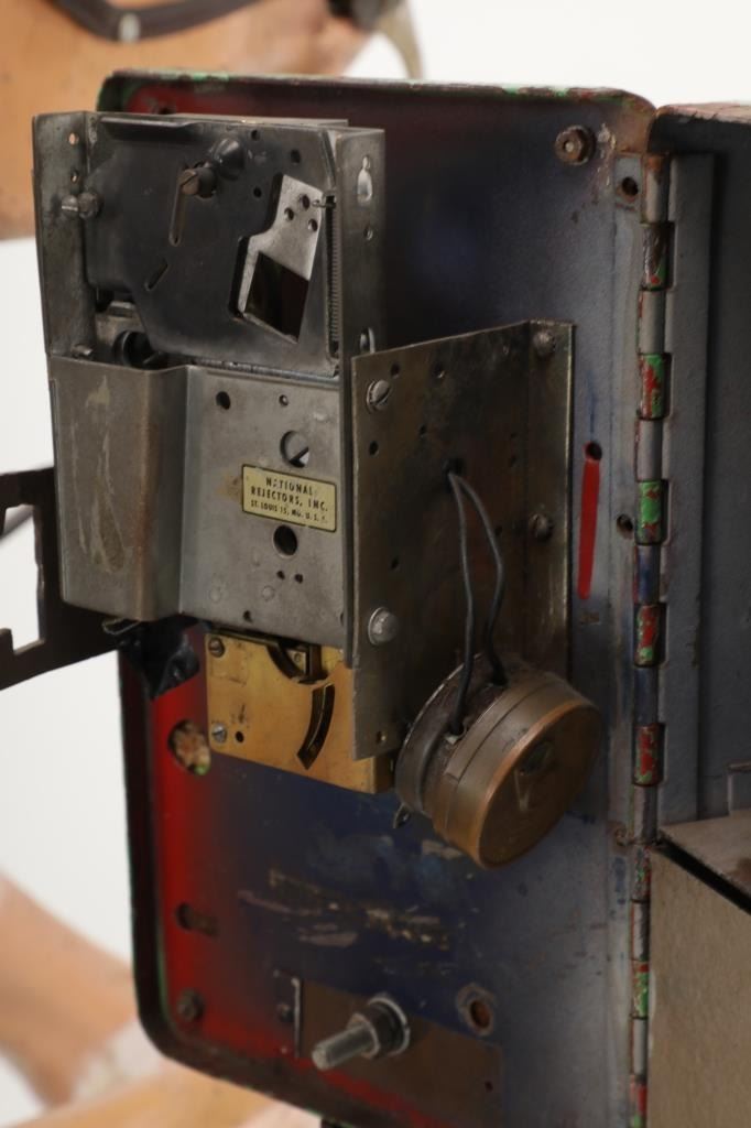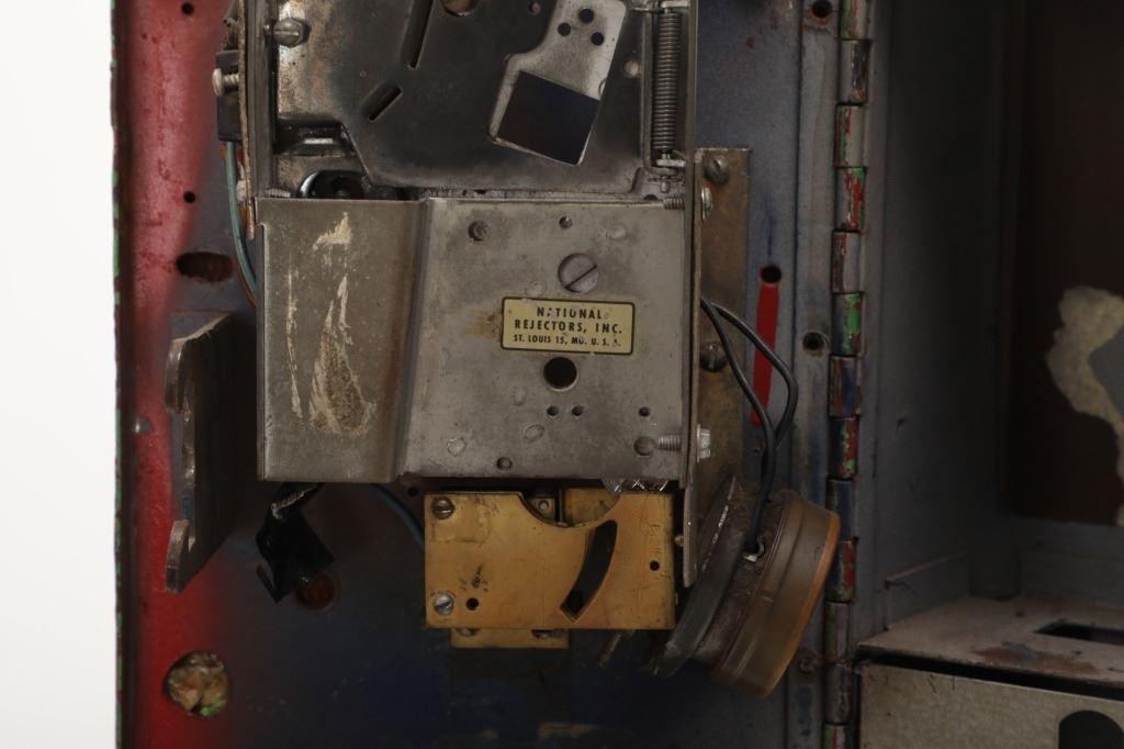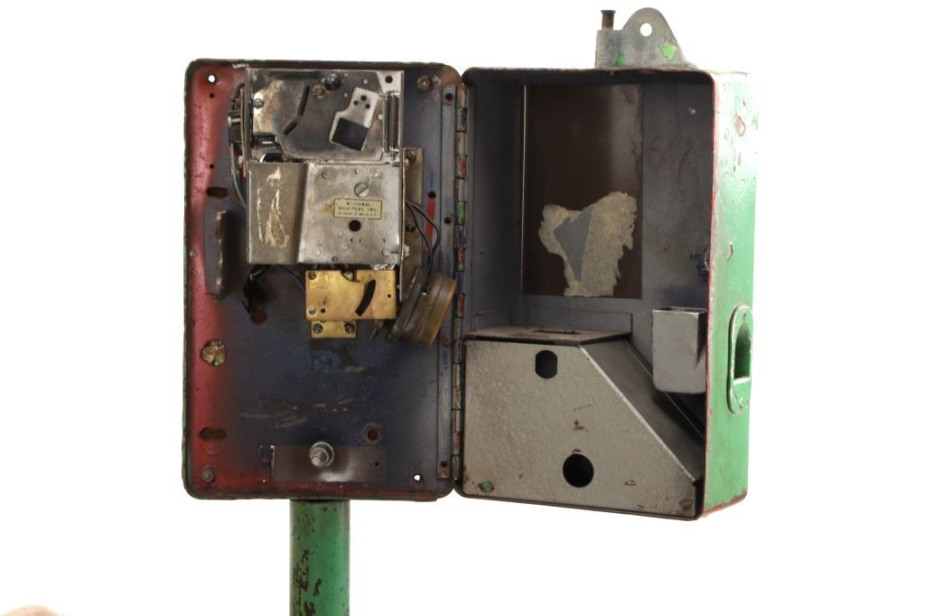 Featured in this lot is a 1950-1960s "Sandy Horse" coin operated mechanical ride. The ride appears to work. James Otto Hahs created the first mechanical horse in 1931, when he constructed one as a Christmas present for his children. The ride was well-liked by the kids, and he immediately saw the necessity to market his innovation. As the original version's wood-carved horses proved to be excessively heavy, Hahs switched to casting aluminum models. The Hahs Gaited Mechanical Horse was recognized for its design and creation in 1932. By the 1950s, "kiddie rides" were one of the fastest-growing industries in America. This horse shows a green metal base with a black rubber rubber slip mat on top and sheet metal on the front and back end of the base. The horse itself shows a beige base color with a black mane and tail. It has a genuine leather saddle, bridle and martingale and features wood and leather stirrups. On one side of the ride is a green painted coin bank where you pay for the ride. The lettering has been worn off and only shows remnants of yellow paint. The ride is in good working order. The horse shows good condition for its vintage age, but it has areas of worn paint and wear from years of use. The ride measures 72" L x 30 1/2" W x 56 1/4" H.* The ride will function when a small metal coin catch is activated when the door is open.