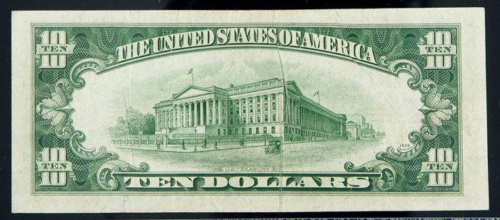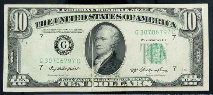 1950-A, $10 Federal Reserve Note. Error: Gutterfolds on