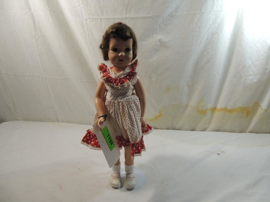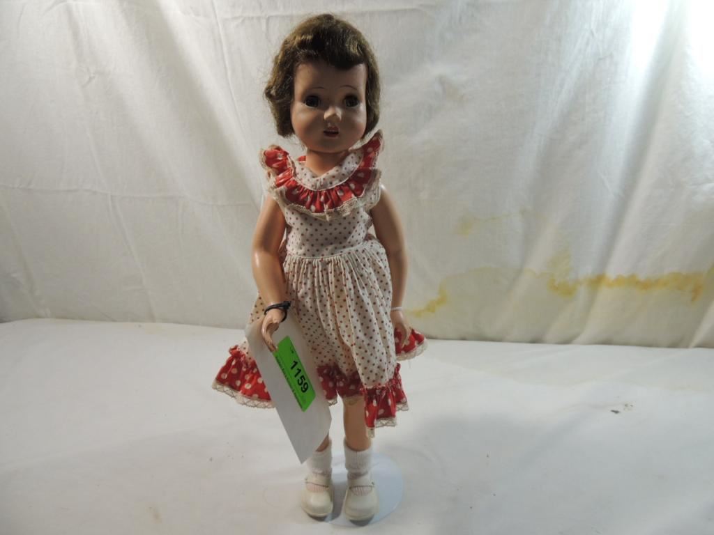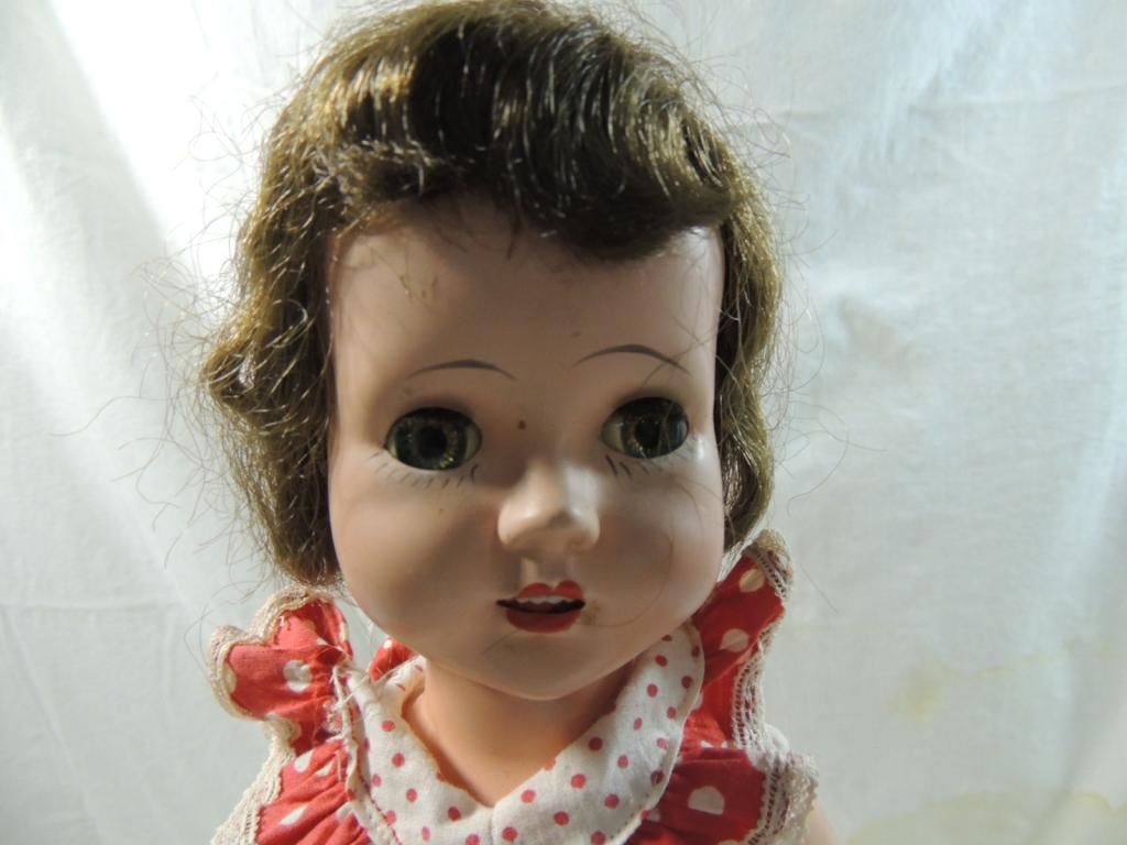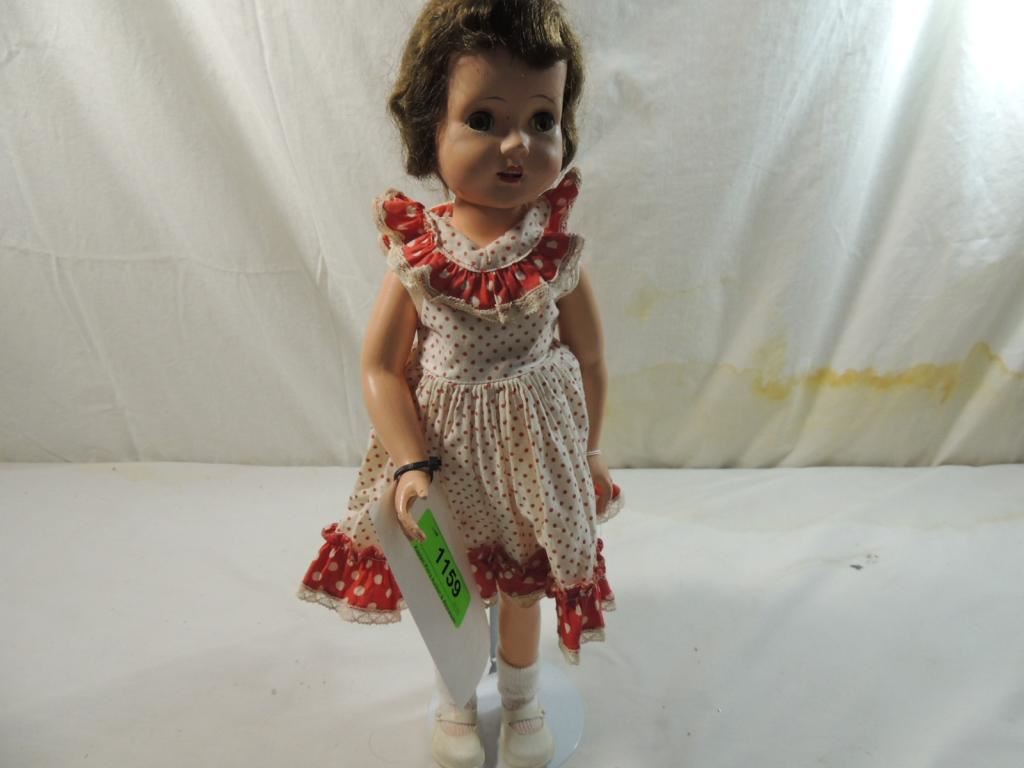 1950s CUTE ALL ORIGINAL HARD PLASTIC DOLL, WALKING DOLL, POKA DOT DRESS, SLEEP EYES AS SHOWN SEE PHOTO FOR MORE DETAILS.