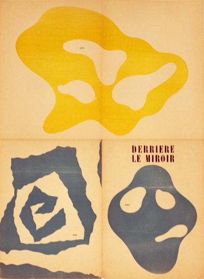 Reference #: ULYY9228 Artist Name: Arp, Jean Title: Page from Derriere le Miroir #33 Medium: Lithograph Edition Size: Unknown Year: 1950 Paper Size: 30 x 22 inches Image Size: 30 x 22 inches Condition: C: Several Signs of use and handling, some visible marks Notes: DLM cover/fold out with 6 poems on the Verso. Double page from DLM#33, published in 1950. Three original woodcust by Joan Arp.