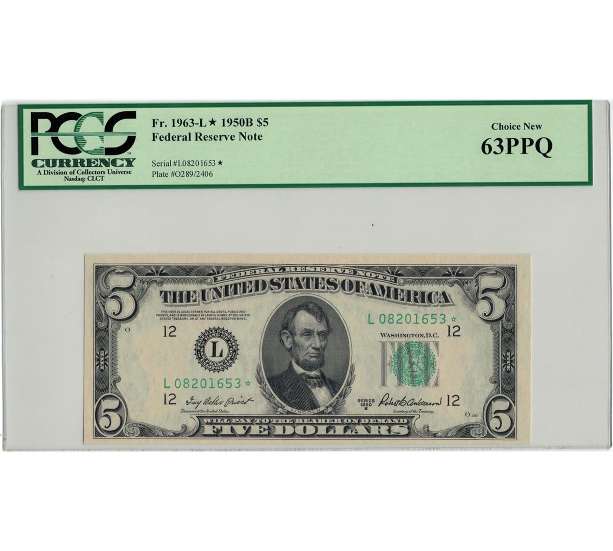 1950-B $5 PCGS Choice New 63PPQ Federal Reserve Note. PCGS Certified.