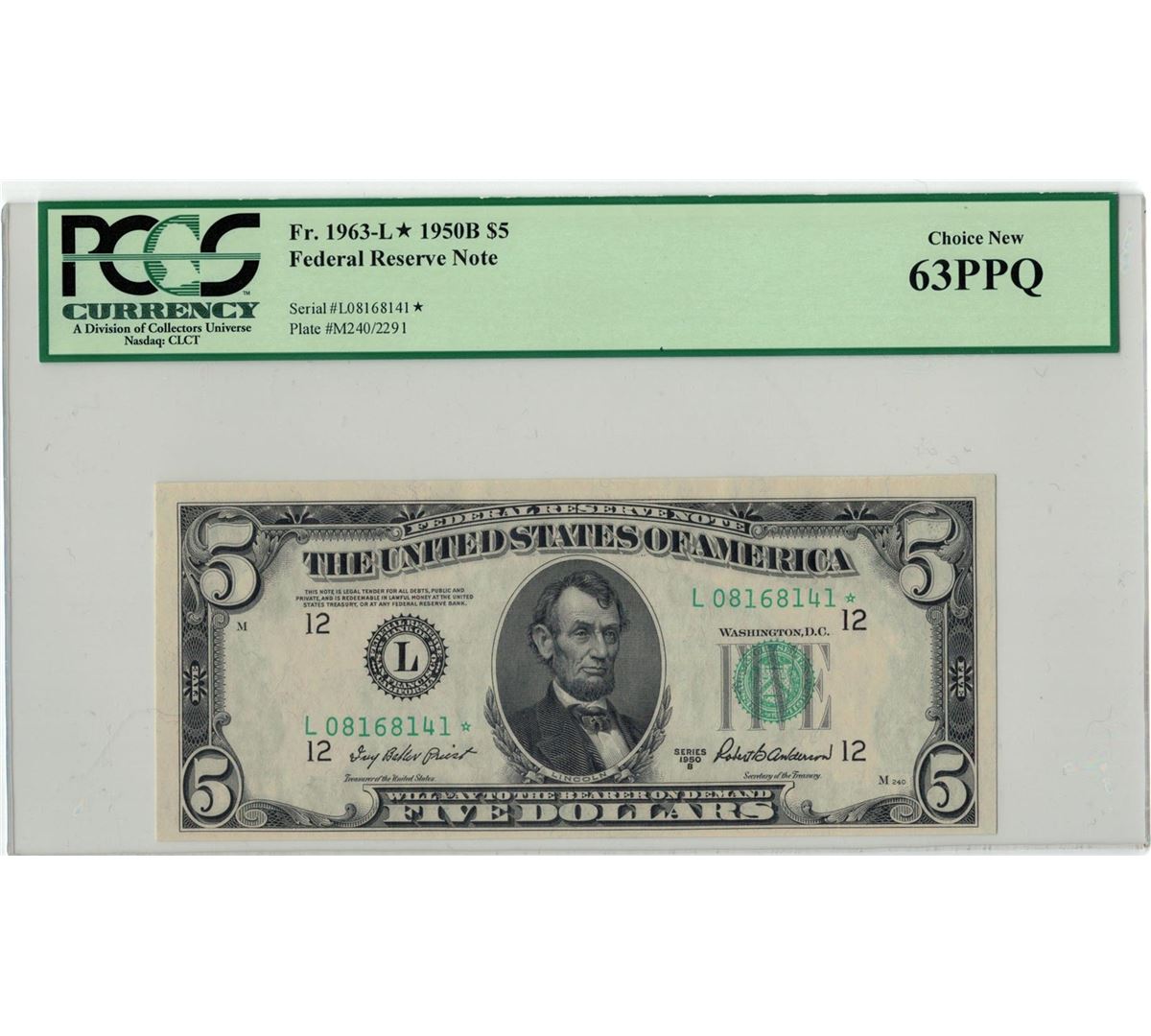 1950-B $5 PCGS Choice New 63PPQ Federal Reserve Note. PCGS Certified.