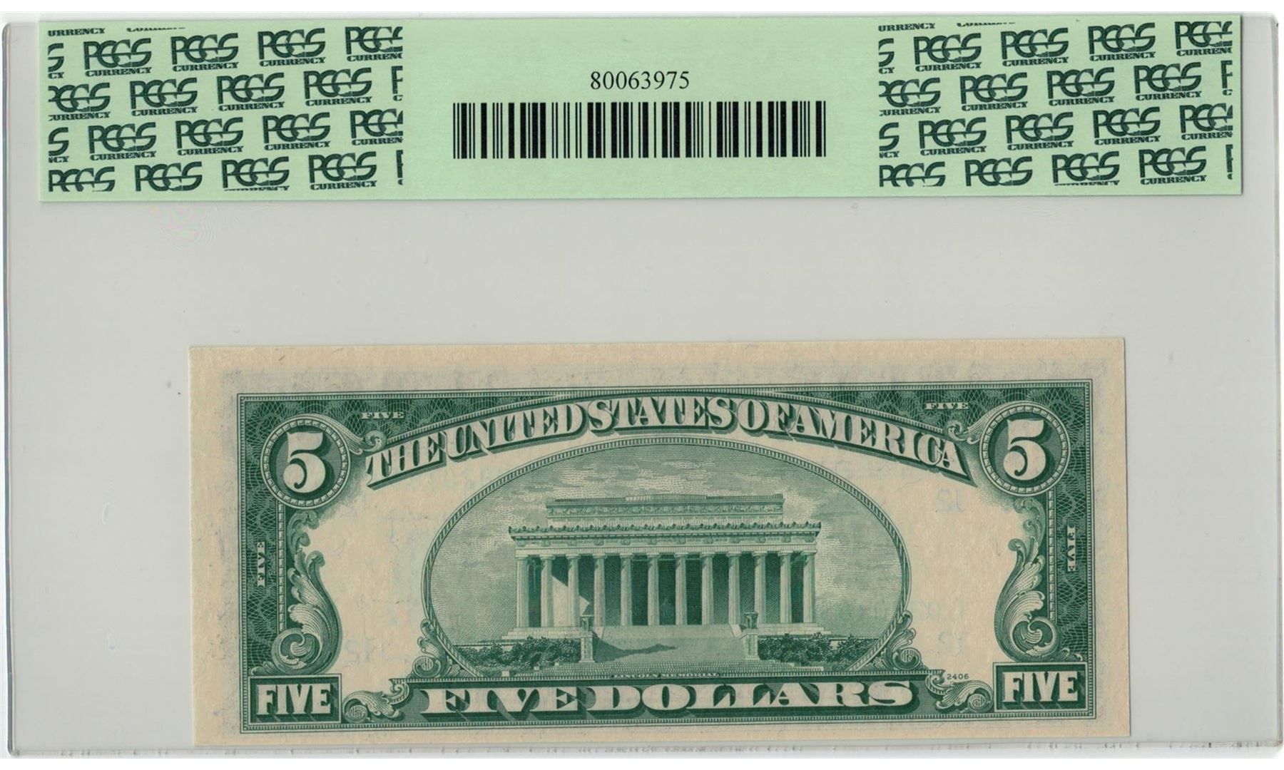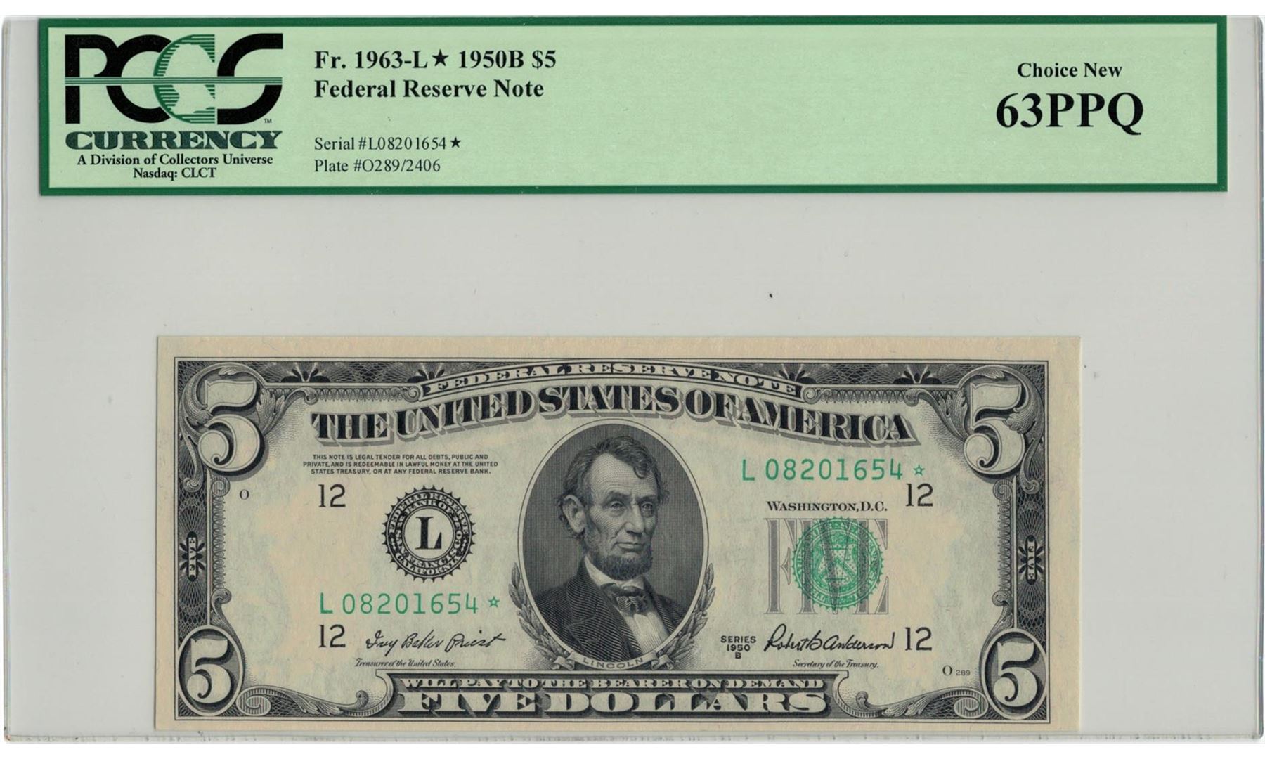1950-B $5 PCGS Choice New 63PPQ Federal Reserve Note. PCGS Certified.