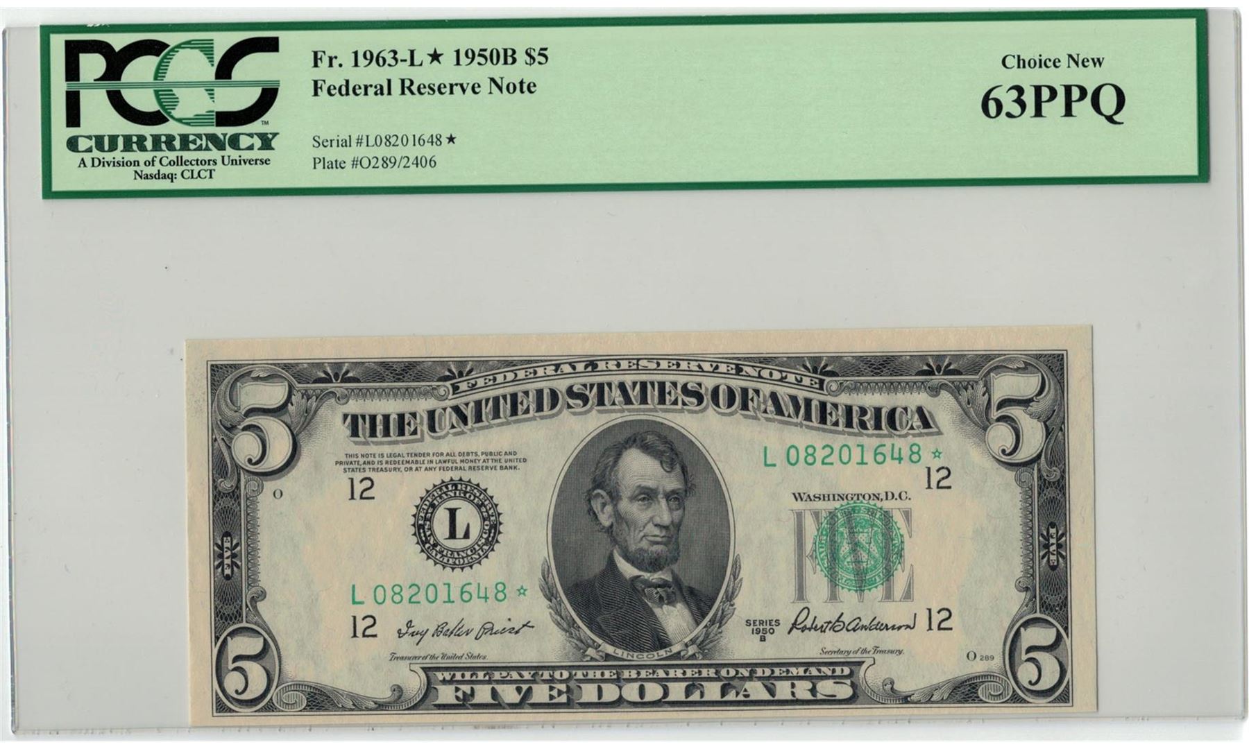 1950-B $5 PCGS Choice New 63PPQ Federal Reserve Note. PCGS Certified.